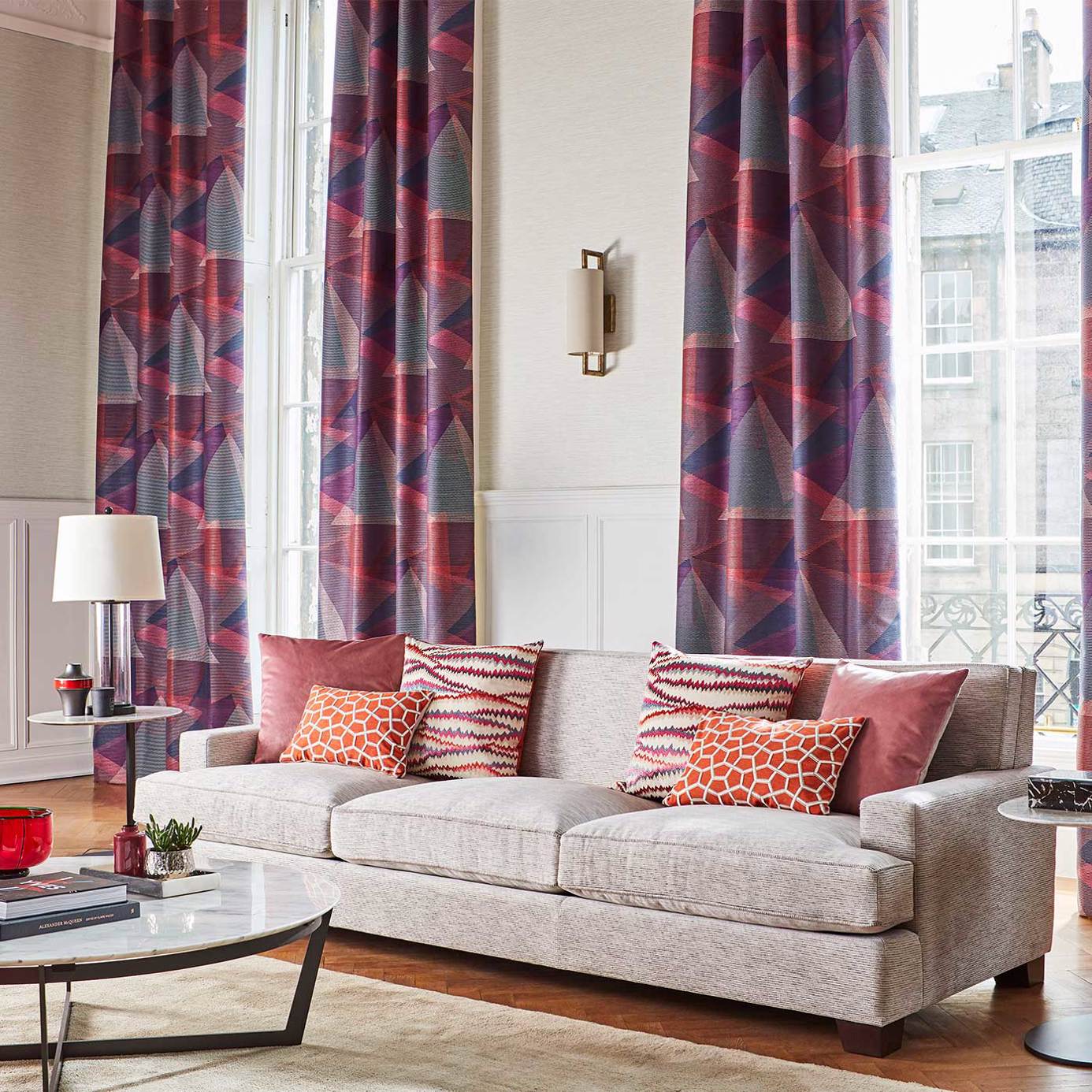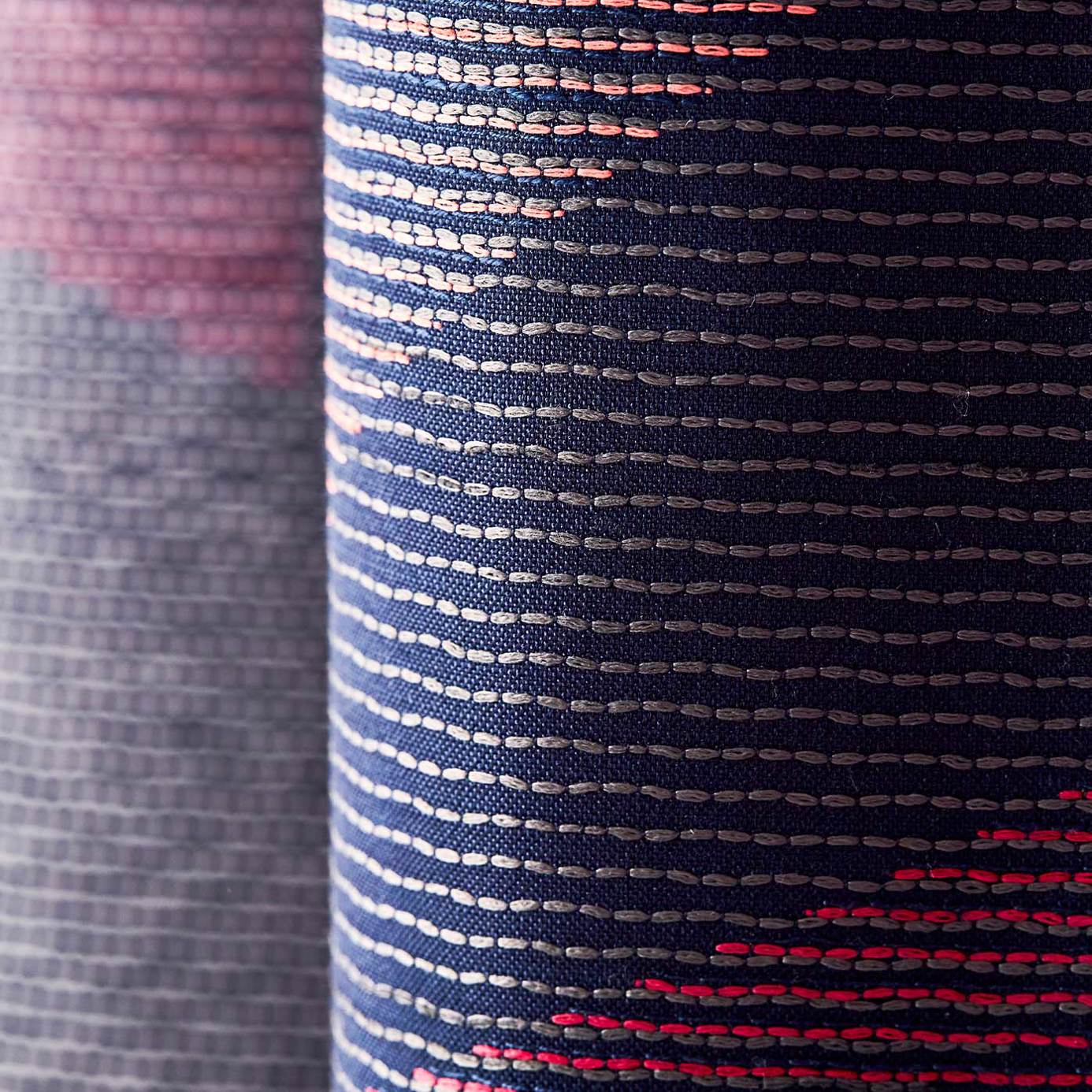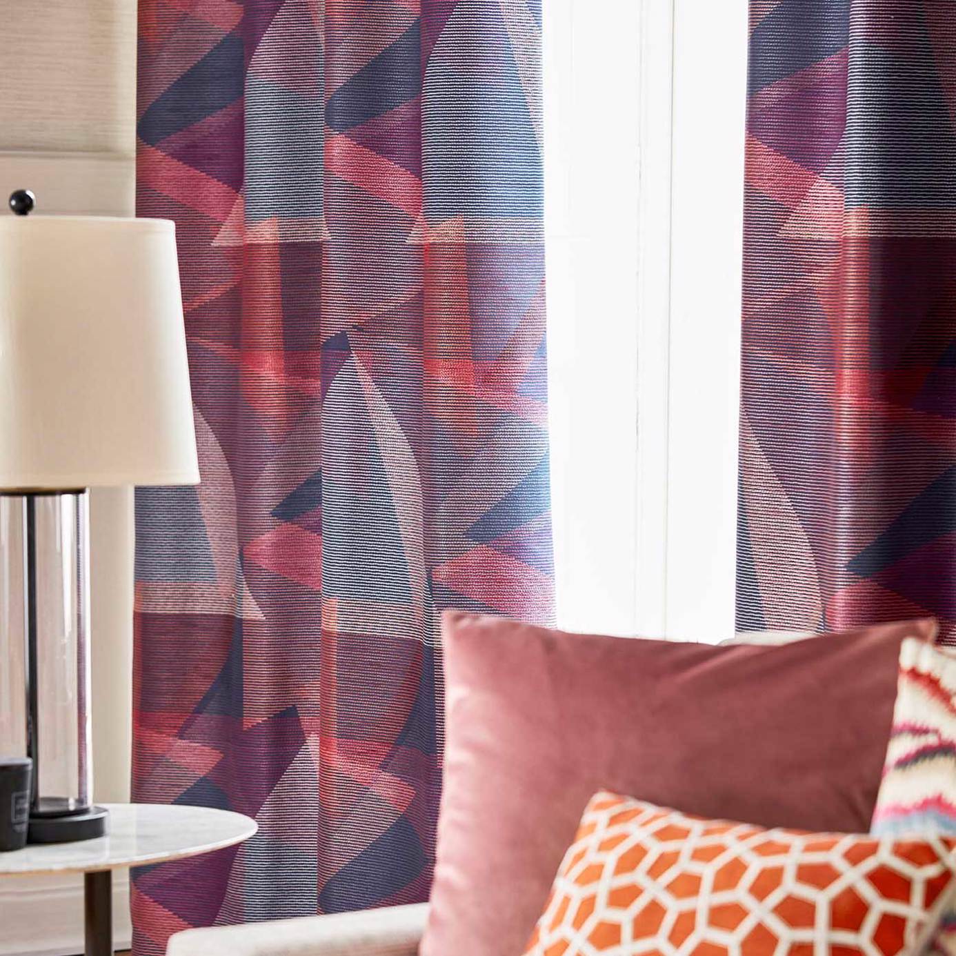 With its striking appearance and contrasting dark ground, Adaxial from Harlequin is a dramatic woven fabric with a subtle iridescent shimmer. Layered geometric shapes represent the shadows cast by architectural formations, accented by a stitch effect that runs throughout.