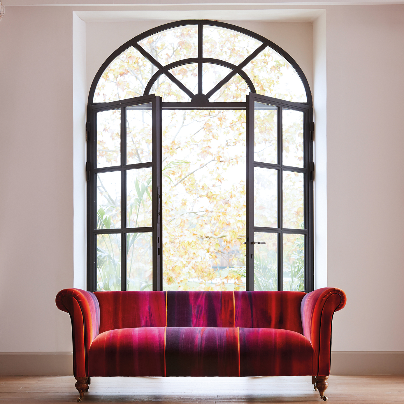 Amazilia Velvets. Rozkošná a zároveň odolná sametová tkanina postrekovaná farbou so šírkou, ktorá sa vytráca a krúti k okrajom. Vhodná na čalúnenie a záclony.