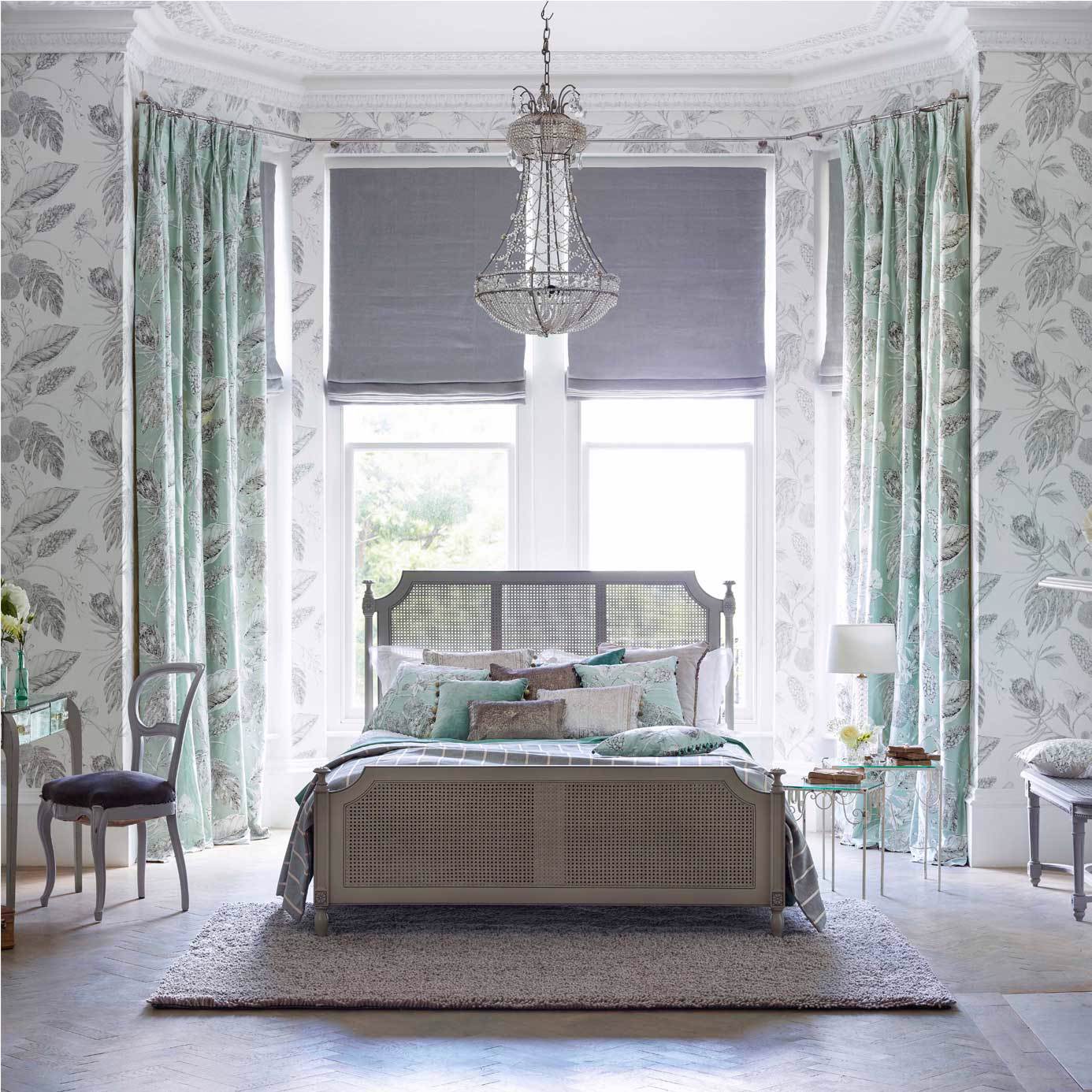 Palmetto Fabrics - Amborella Silk. A botanical vintage-style silk fabric design featuring delicately drawn butterflies, pinecones and exotic flowers. Elegant for blinds and drapes.