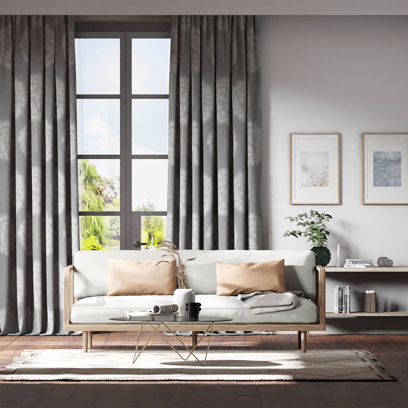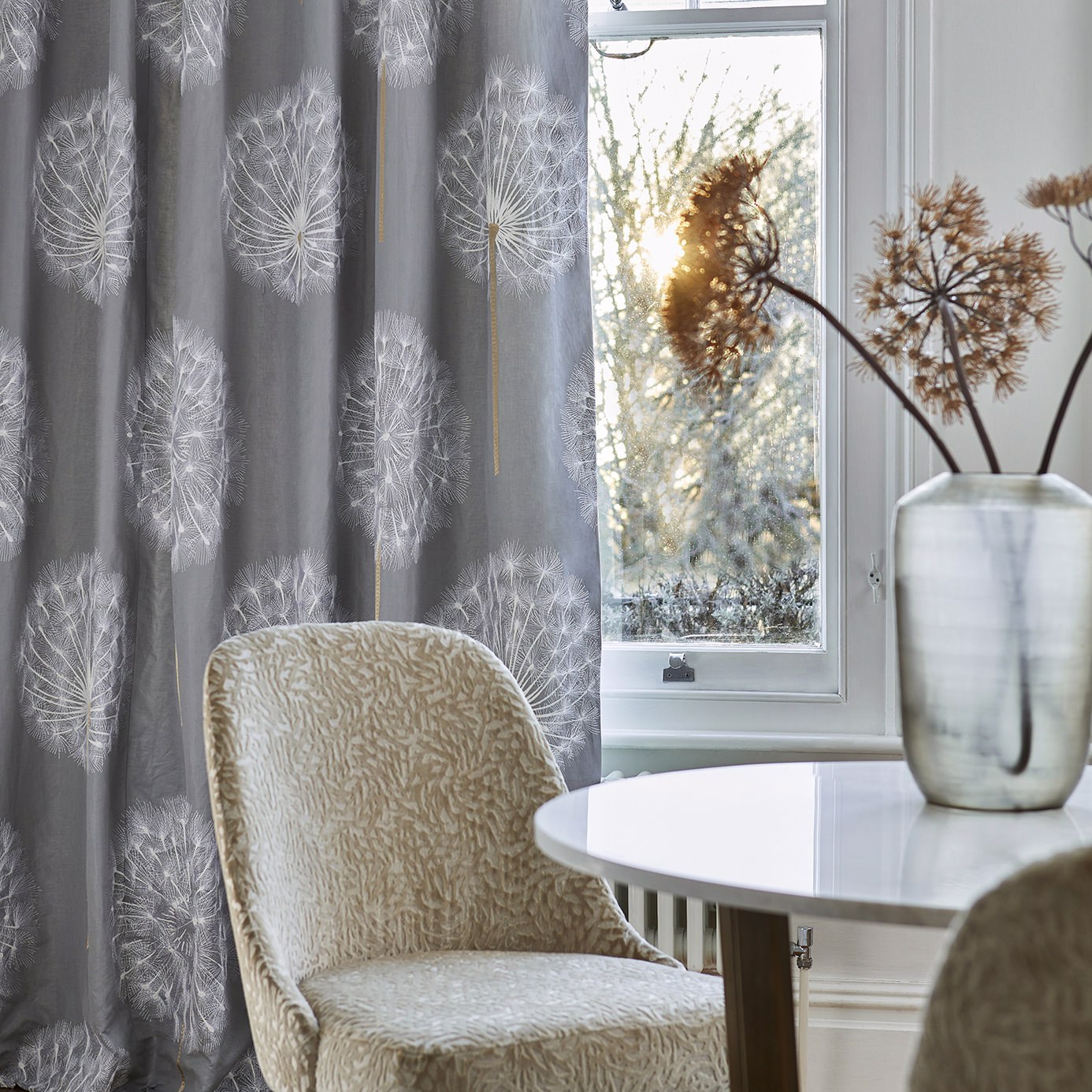 Paloma Fabrics - Amity. Chalky white embroidered dandelions repeat across this fabric in calming colourways. Use this beautiful fabric alongside the wallpaper of the same name for maximum impact.