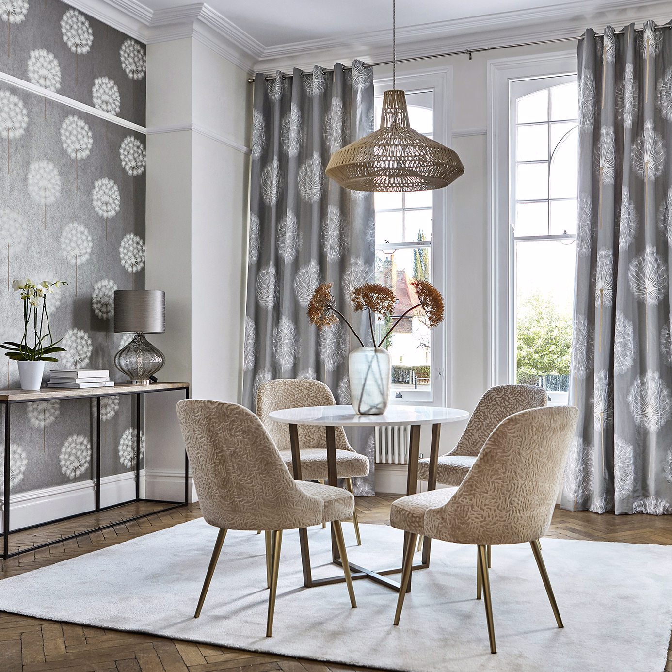 Paloma Fabrics - Amity. Chalky white embroidered dandelions repeat across this fabric in calming colourways. Use this beautiful fabric alongside the wallpaper of the same name for maximum impact.