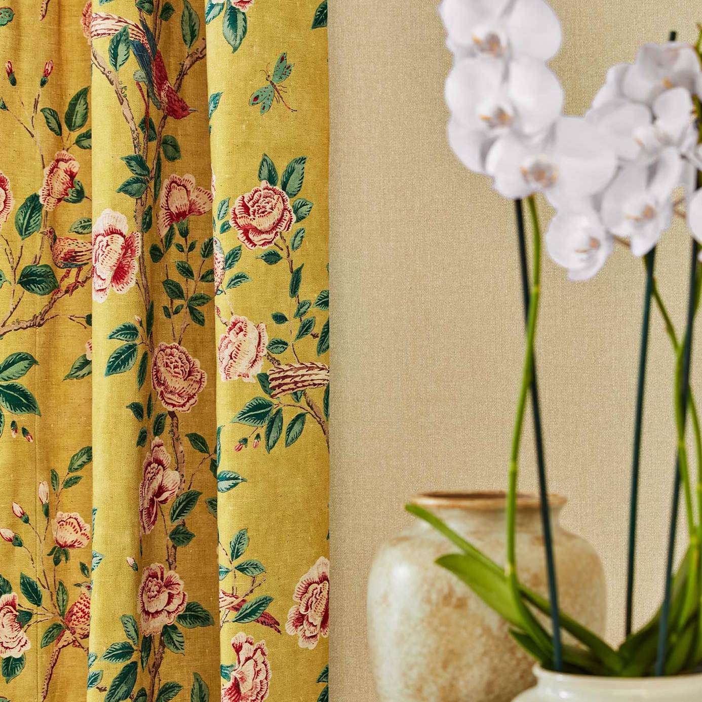 This classic archive print of abundant flowers and foliage is sprinkled with delicate dragonflies and fluttering butterflies in a nod towards its Chinoiserie roots. A dual-purpose design, Andhara is available on cotton/linen and satin cloths across four colourways.