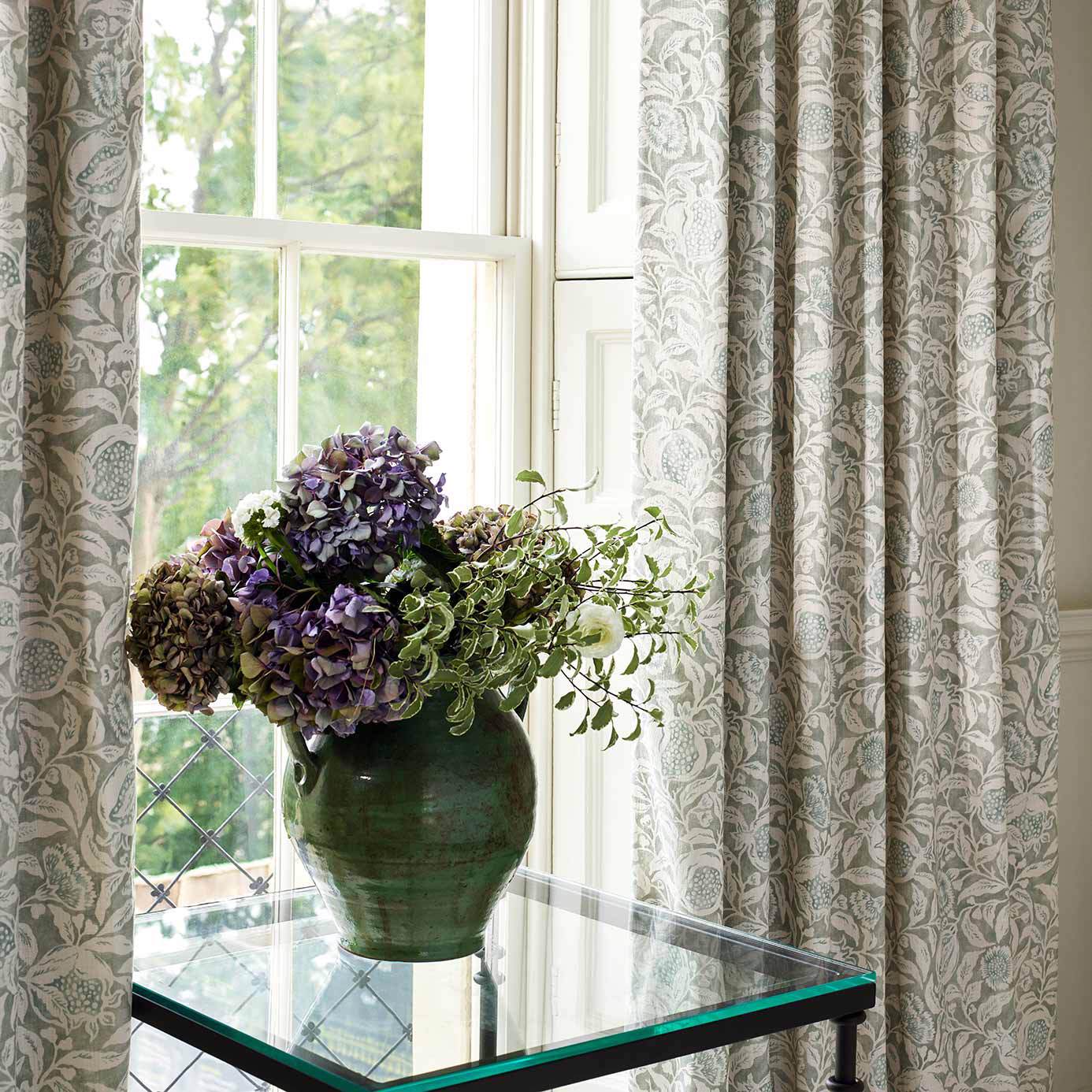 Featuring a combination of foliage, flowers and pomegranates, this charming linen-mix fabric has the handcrafted look of a wood-block printed design. The subtle colourways complement the crumbled textured backgrounds and a wallpaper of the same name is also available.