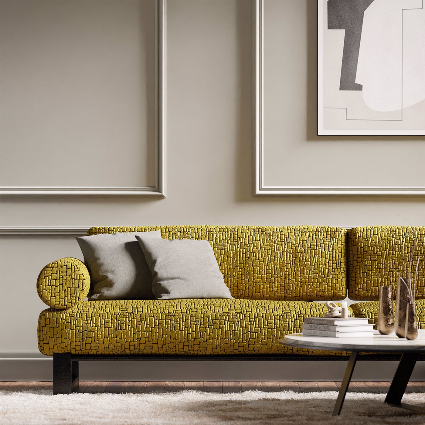 A cut velvet resembling mosaic pebbles in a dramatic palette of jewel tones and neutrals.