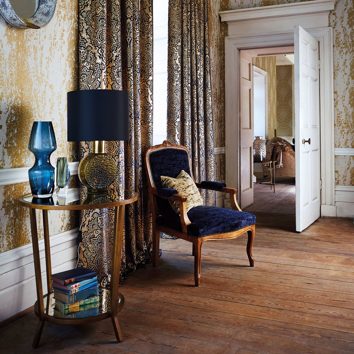 Leonida Velvets - Aurelia. A majestic paisley motif with a dramatic foil overlay, this cotton-blend velvet fabric is suitable for upholstery and available in both dramatically dark and gentle colourways. A wallpaper of the same name is also available.