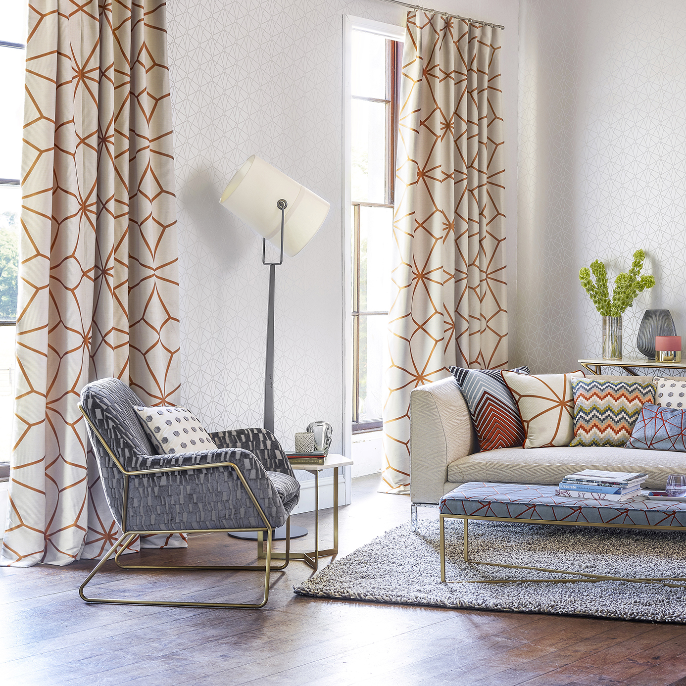 This large-scale geometric jacquard design with a highlight colour and contrasting textured ground gives the illusion of depth in fabric. Axal is also available as a wallcovering.