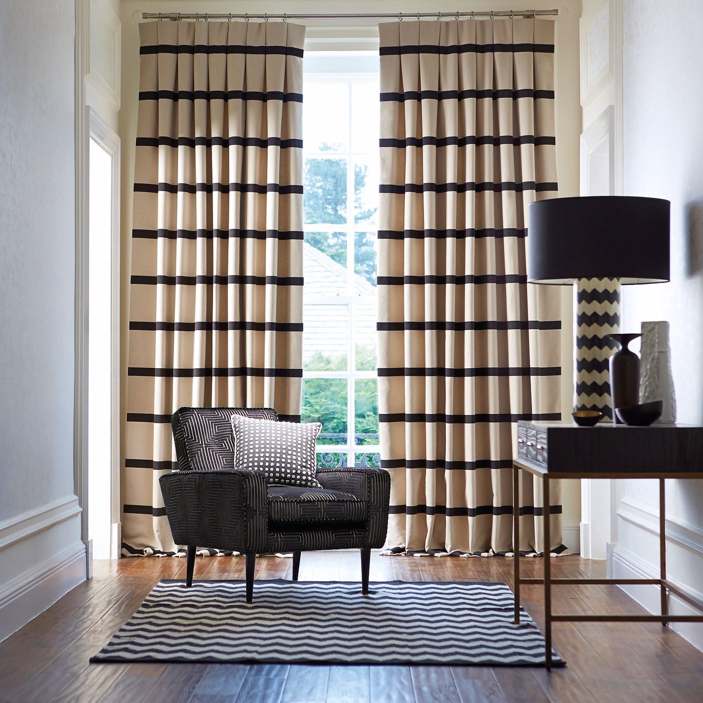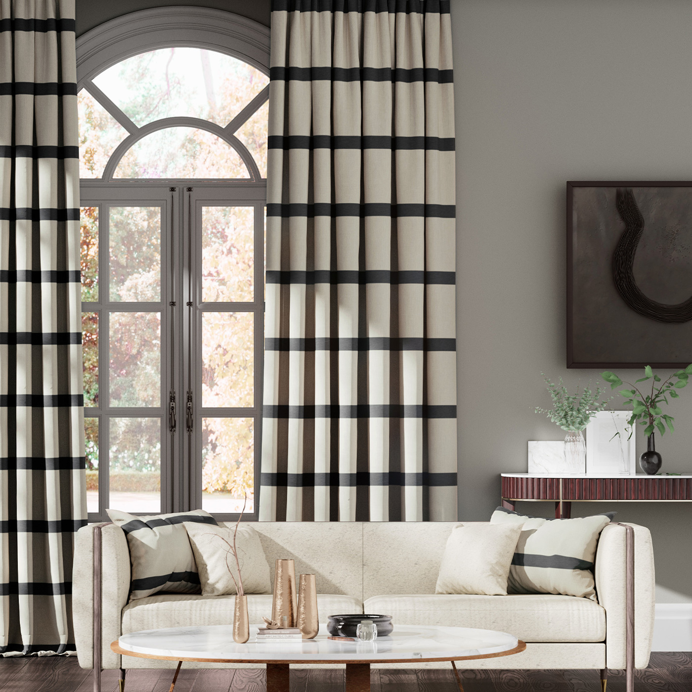 Látka z miešaniny ľanu a vlny vyšívaná farebným vodorovným pruhom pre pekné záclony a žalúzie.