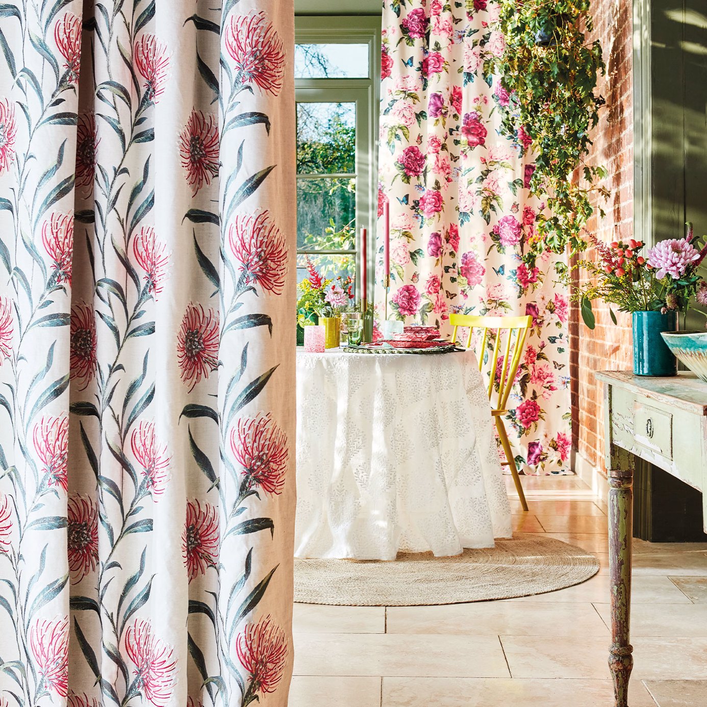 Perfect for use throughout the home this beautifully detailed design shows the Pincushion Protea in all its glory. Embroidered in a viscose thread on a cotton ground a delicate shimmer highlights the colours and textures of the fabric's flowers and leaves. Available in three colourways: Fuchsia Hay and Silver Mint