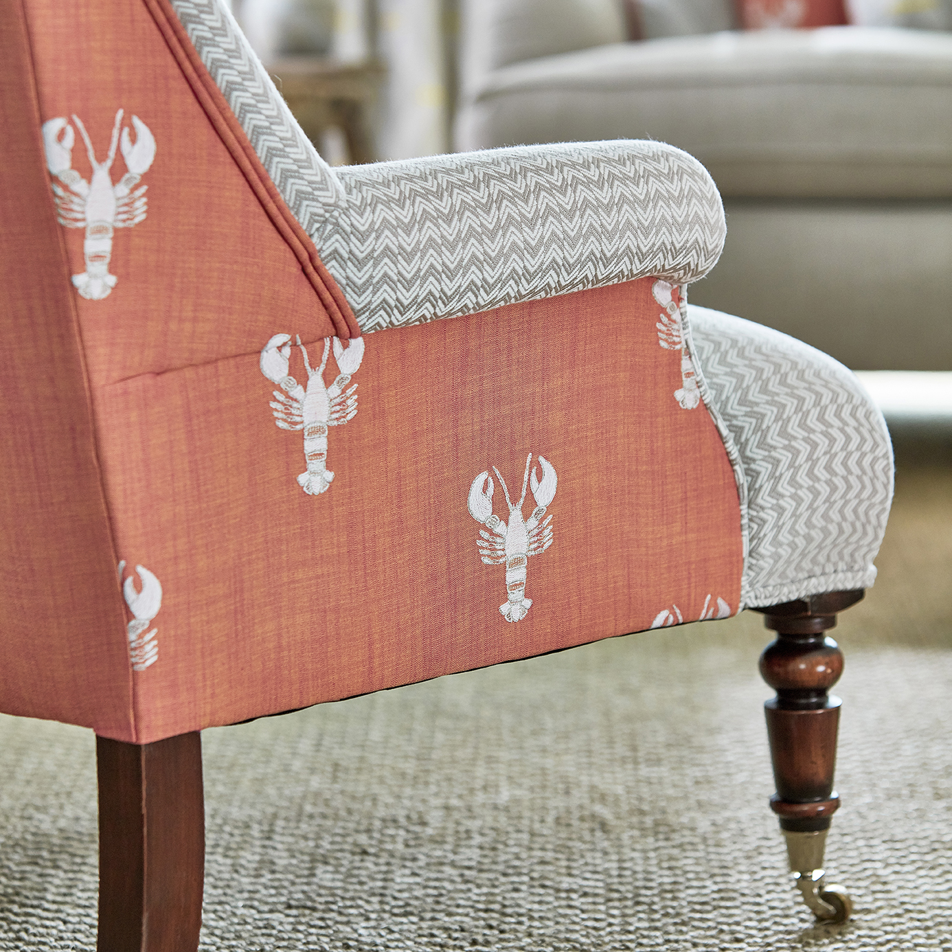 Embroidered lounging lobsters sit proudly upon this cheerful fabric inspired by the annual Crab and Lobster Festival in Cromer, Norfolk. The original artwork was created using lino printing on textured paper to add depth to the design. Team with driftwood inspired furniture, or the wallpaper and printed fabric of the same name.