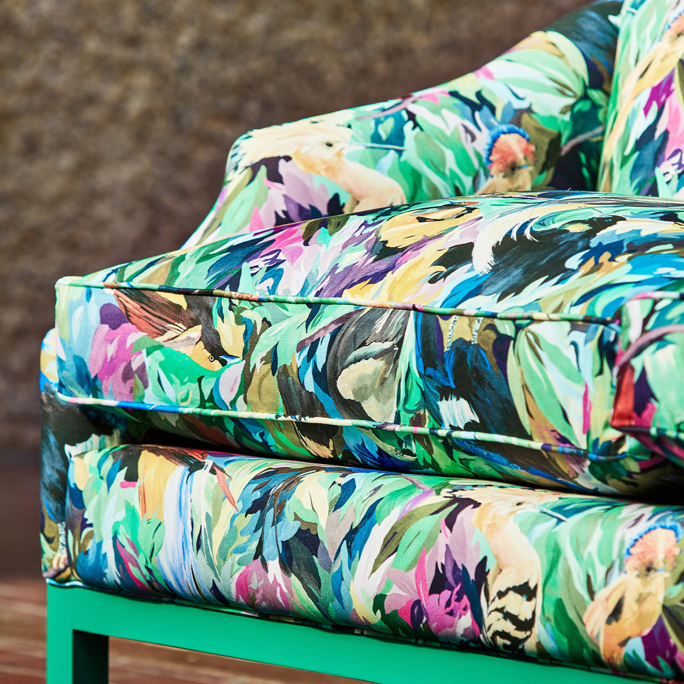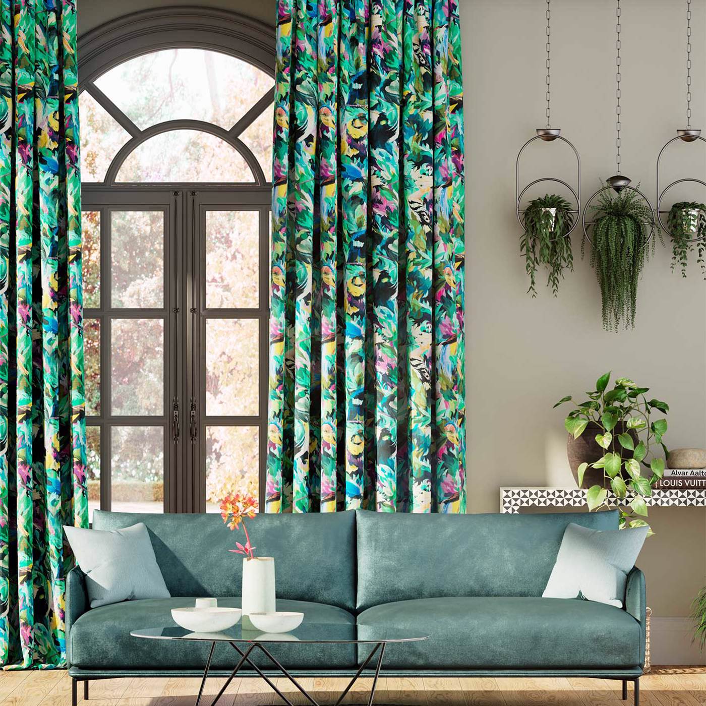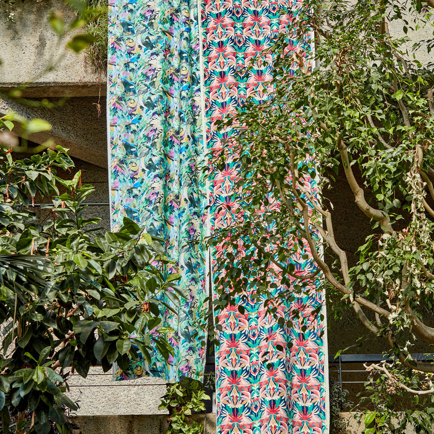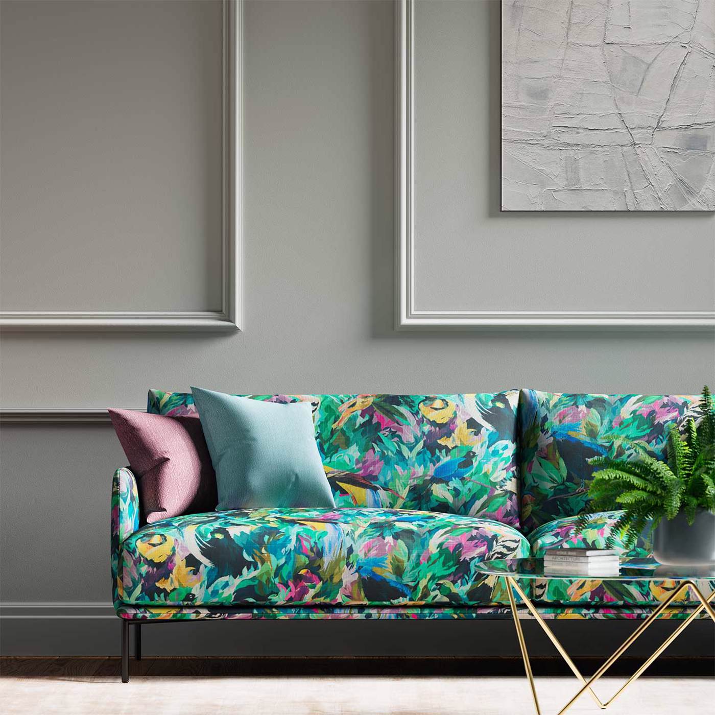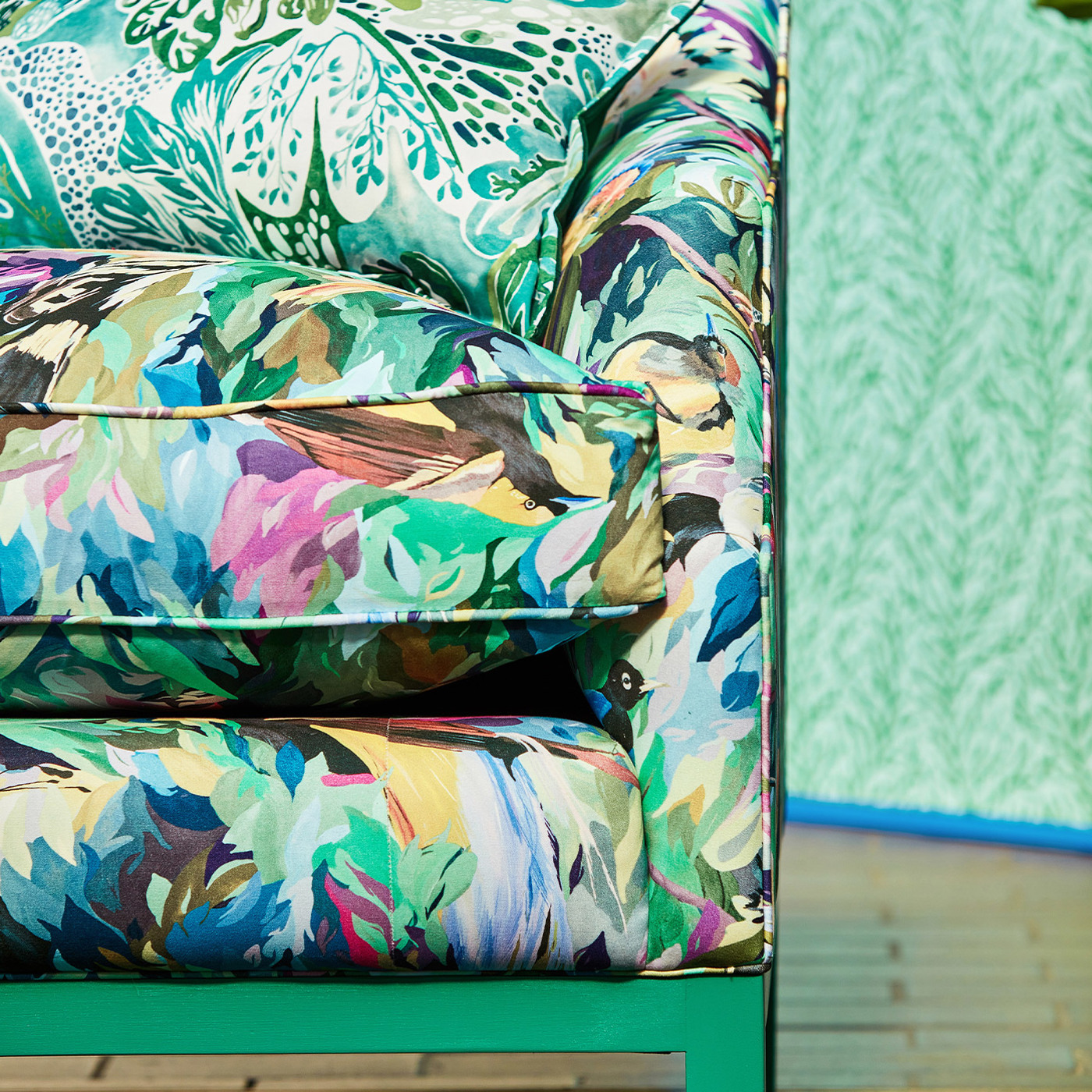 Blink and you'll miss them! Our spectacular birds of paradise dance amongst the darkness of their rainforest home. Look twice how many incredible plumages and tailfeathers can you spot? Full of movement, yet colourful and camouflaged, this dual-purpose cotton is an absolute showstopper.