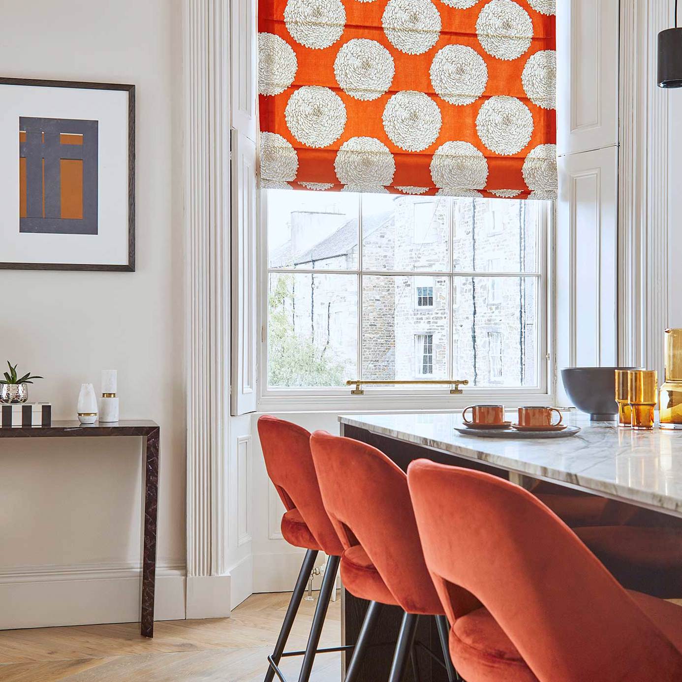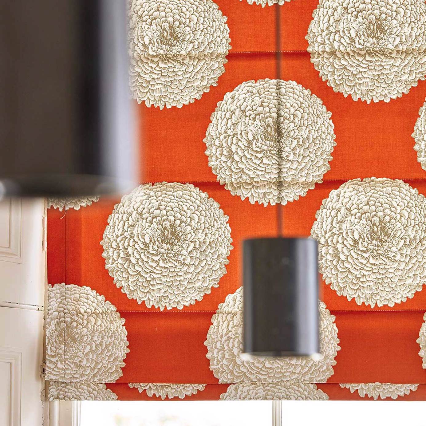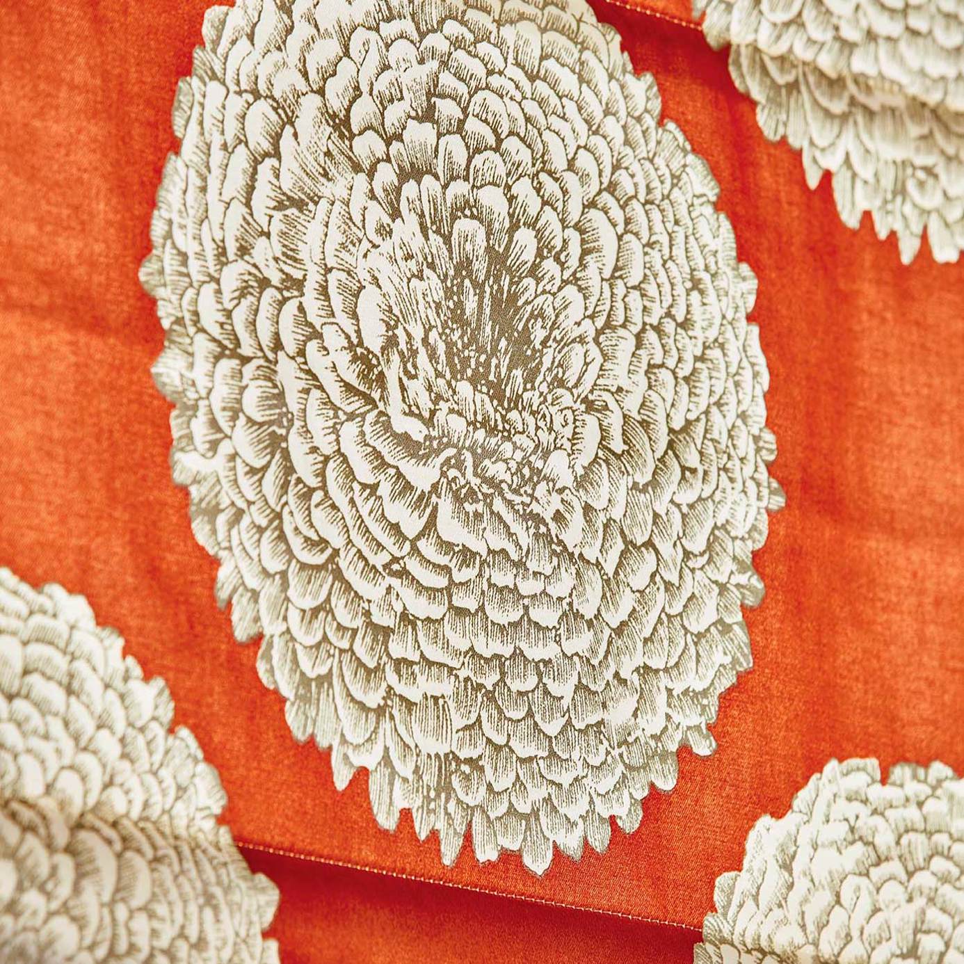 On a soft satin ground, printed Pompom dahlias bloom confidently. The Tulip and Cayenne colourways display an accent detail of intricate shimmering gold.