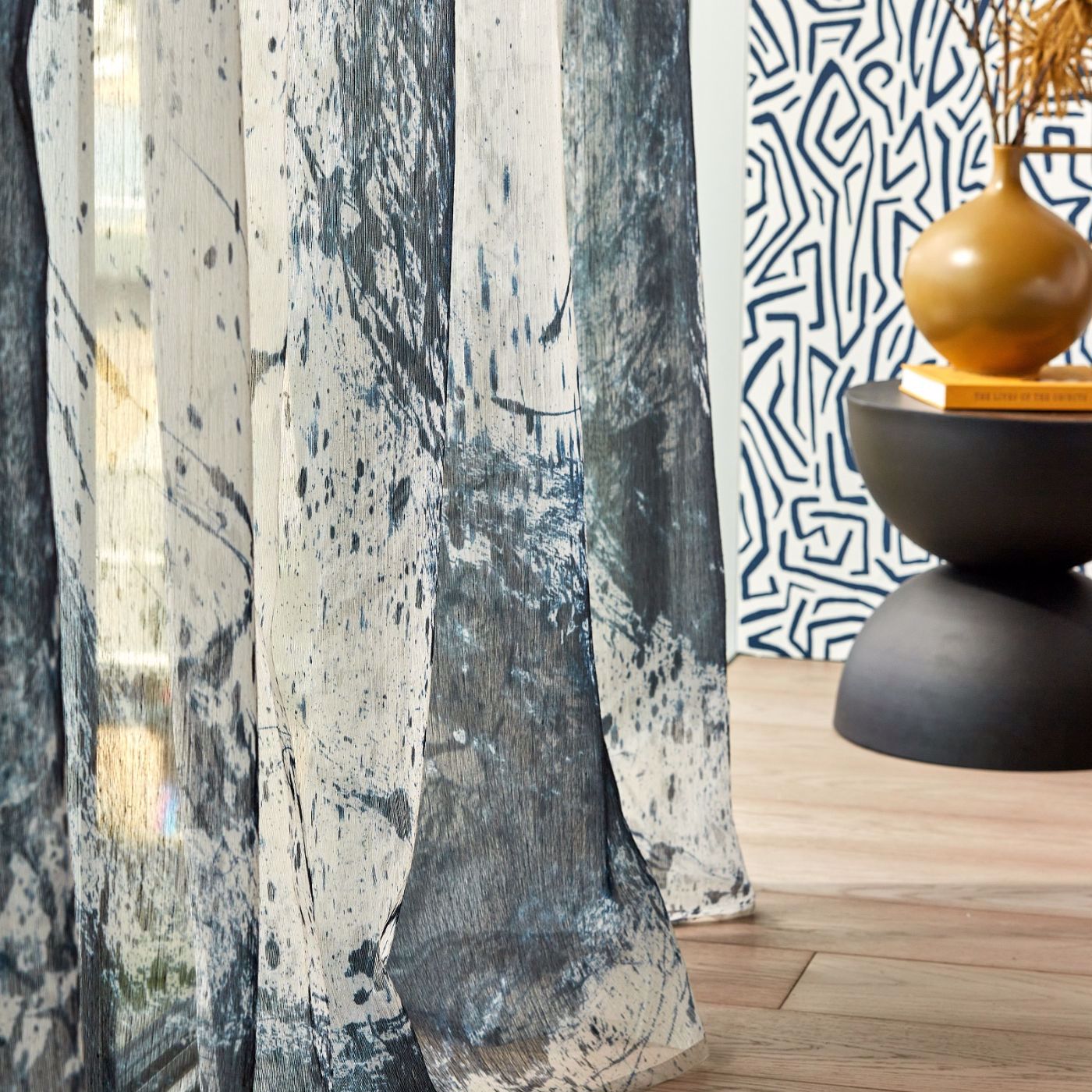 Plný voľného pohybu a vytvorený vonku expresívnou rukou sa abstraktné značky kroutia a otáčajú sa cez obrovské opakovanie 3x3m na polotransparentnom pozadí. Súčasný a výrazný, Enigmatic Sheer je inšpirovaný fenoménom kinetického umenia z polovice storočia - je tiež inherentne odolný voči ohňu.