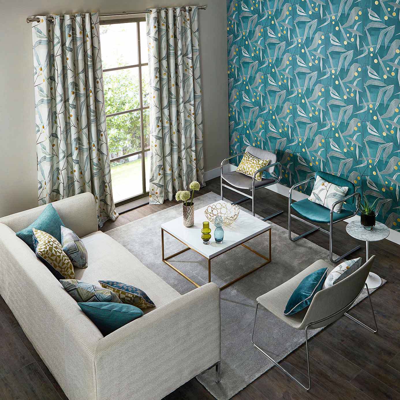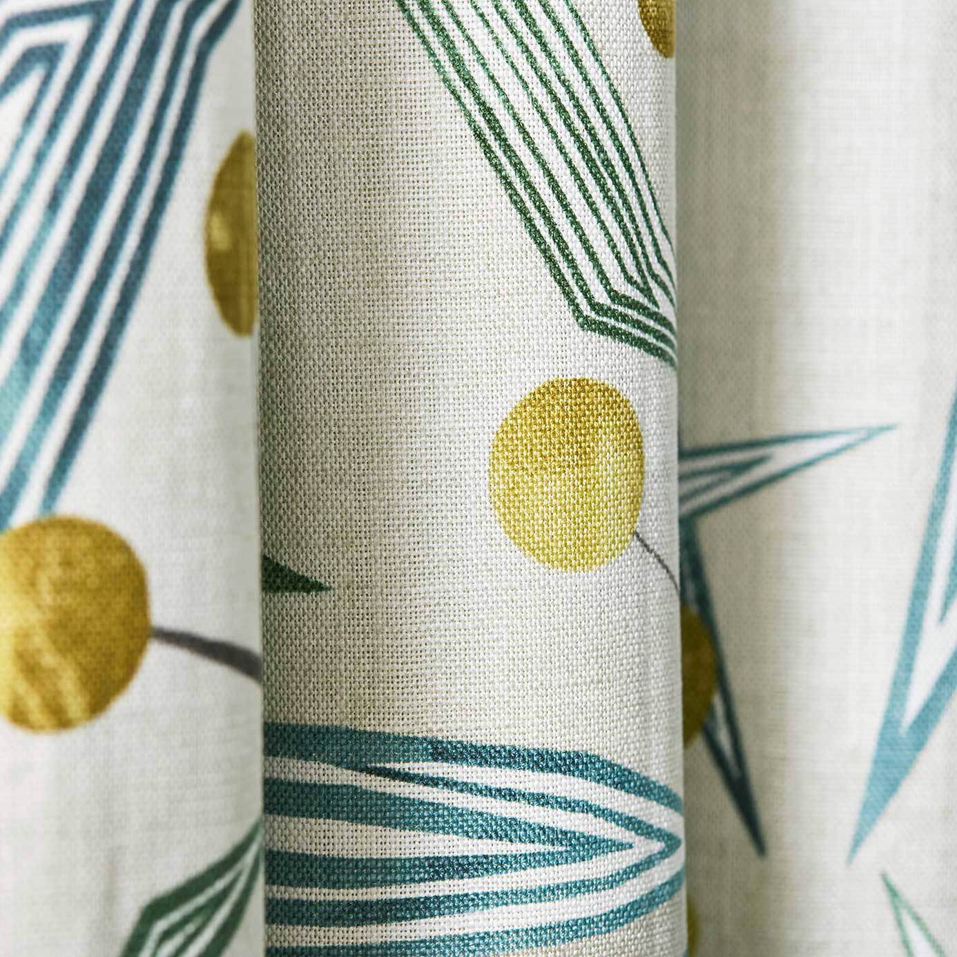 Sharing its name with the Entity collection this confident fabric features an angular geo-floral with stylised leaves and spots for buds set against an ample ground.