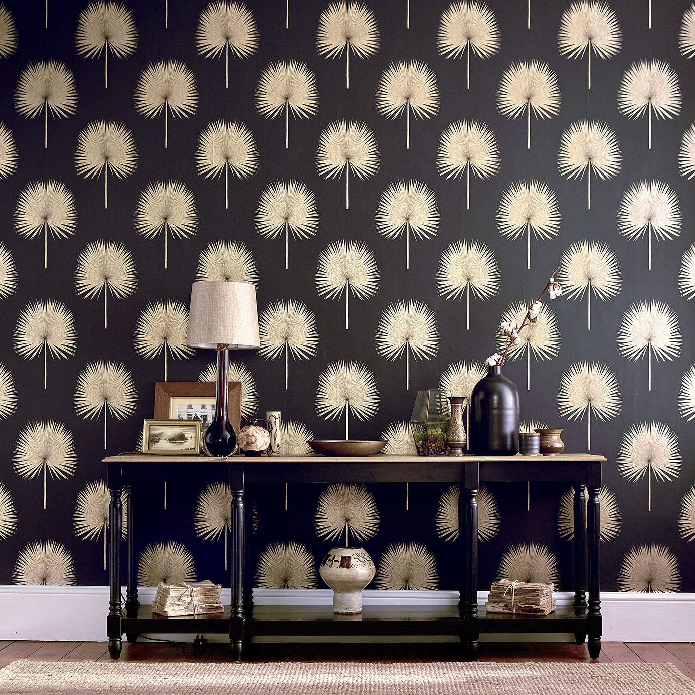 A smart useable wallpaper for a variety of living spaces, Fan Palm from Sanderson creates an elegant silhouette shape with fine line work bringing a subtle textural look. Metallic inks offset with the Linen, Charcoal and Rhodera colourways to dramatic effect.