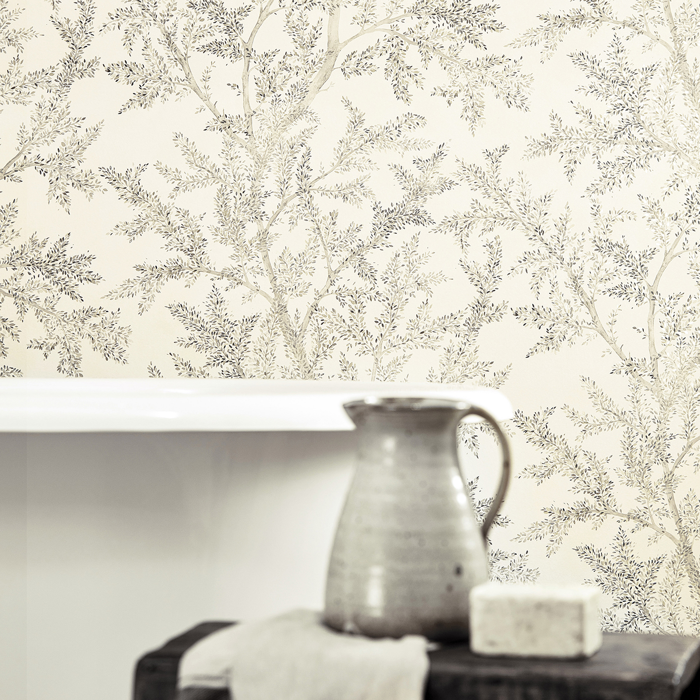 Entwined birch tree branches trail upwards on this whimsical wallpaper design which was inspired by a painted sampler discovered in the archive. Branches shimmer with metallic highlights and tonal watercolour layers add to the designs enchanting feel. Available in neutral colourways and ideal for spaces in need of light.