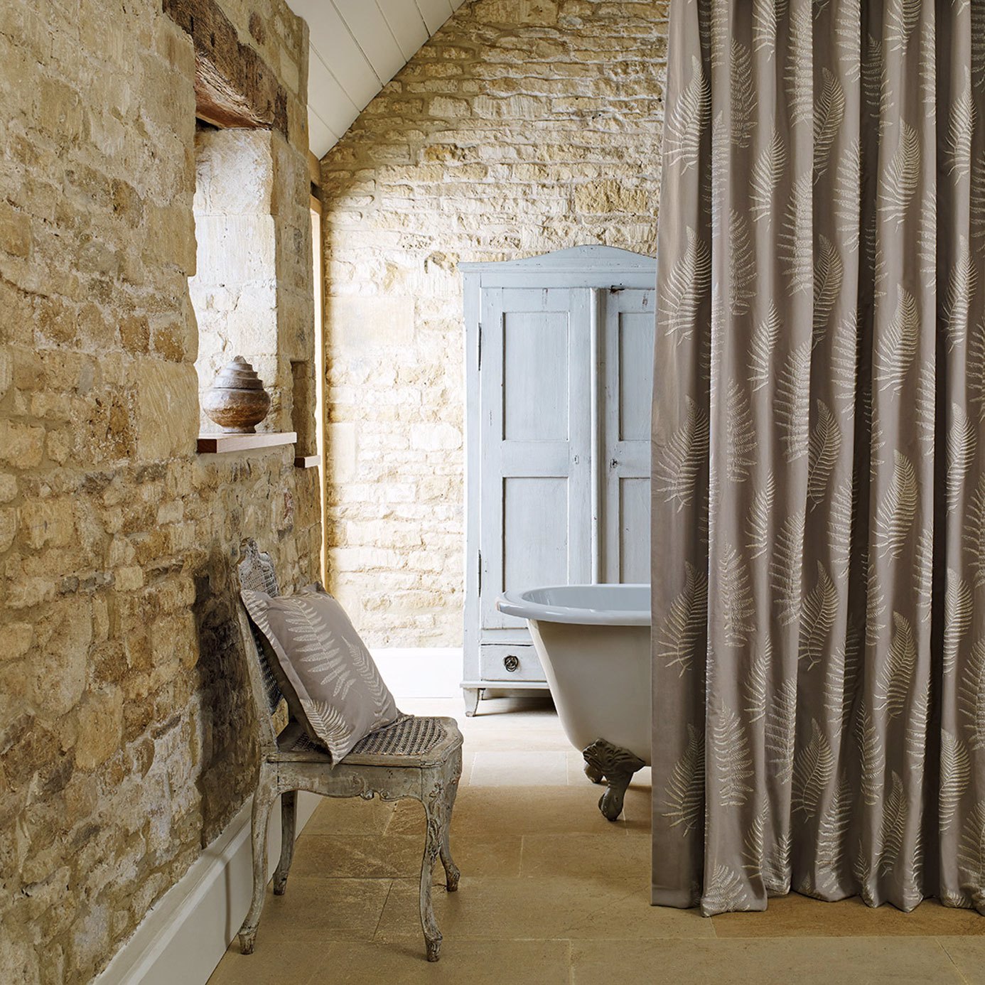 A finely embroidered pattern of fern leaves is embroidered onto a crisp, fresh, cotton fabric. Available in five colourways inspired by nature: mist, ivory, moss, powder blue and pebble.