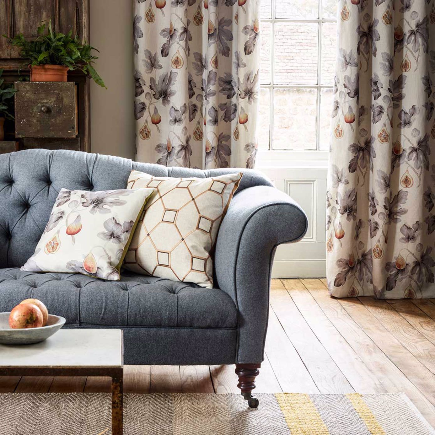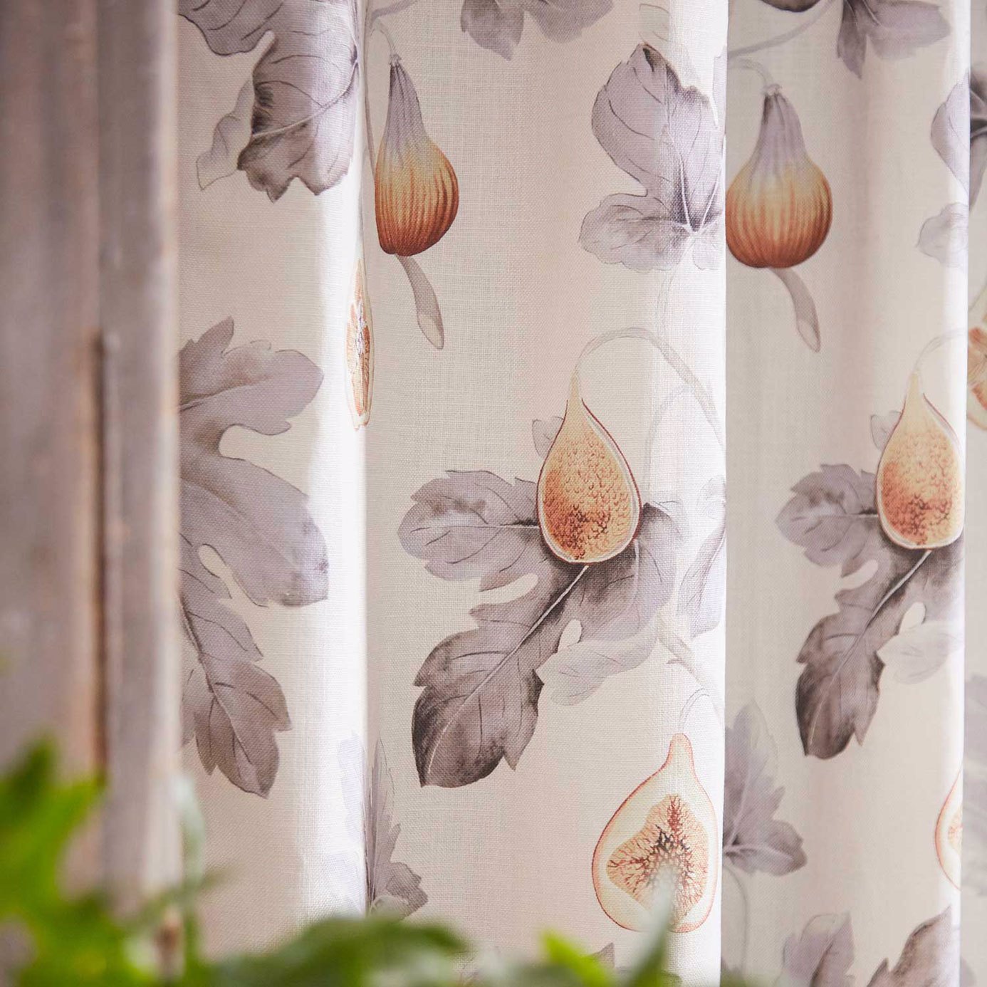 A botanical study of figs feature on this linen-mix fabric, which incorporates the fruits large leaves and intricate details delicately created with a painterly watercolour effect. Used for curtains, this design effortlessly frames the view beyond the window.