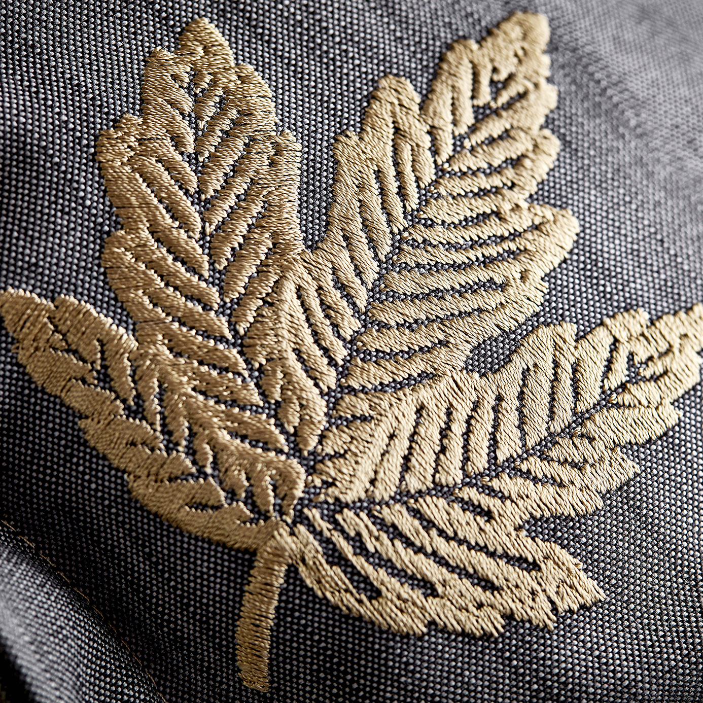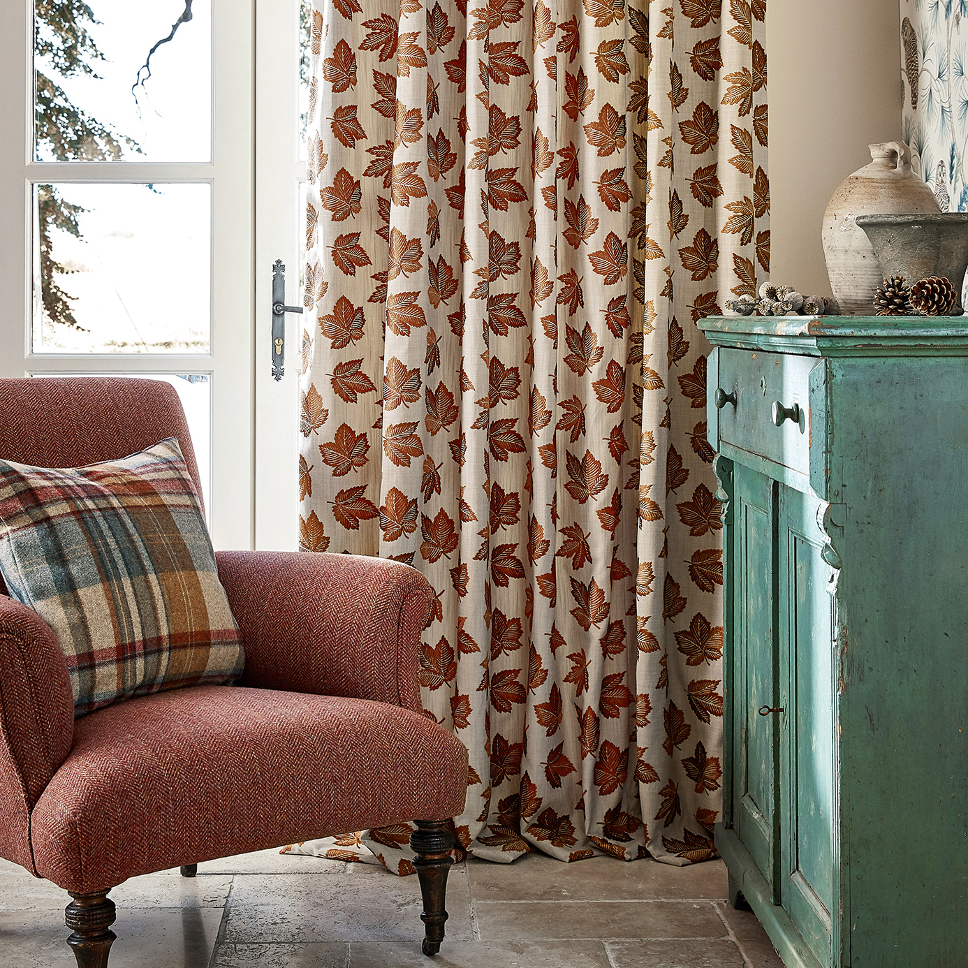 Elegant and smart, simple spaced maple leaves are embroidered in shiny fine viscose yarn against a natural textured cloth - perfect for adding a touch of glamour to the home and available in autumnal colourways.