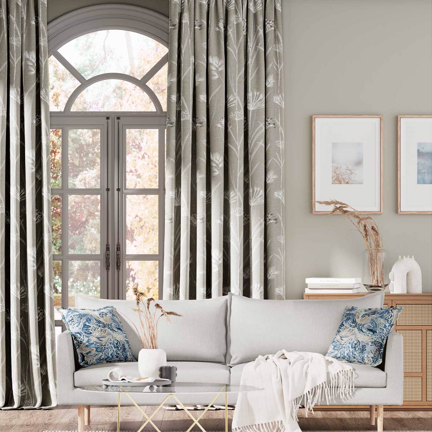 Účinný dizajn semienok a tráv otlačený na ľanovom plátne zdobenom vyšívanými francúzskymi uzločkami a drobnými korálkami. Tento dizajn je dostupný na ľanovom podklade a v tmavšej verzii s atramentom. Použite tento dizajn na žalúzie a záclony v modernom vidieckom prostredí.