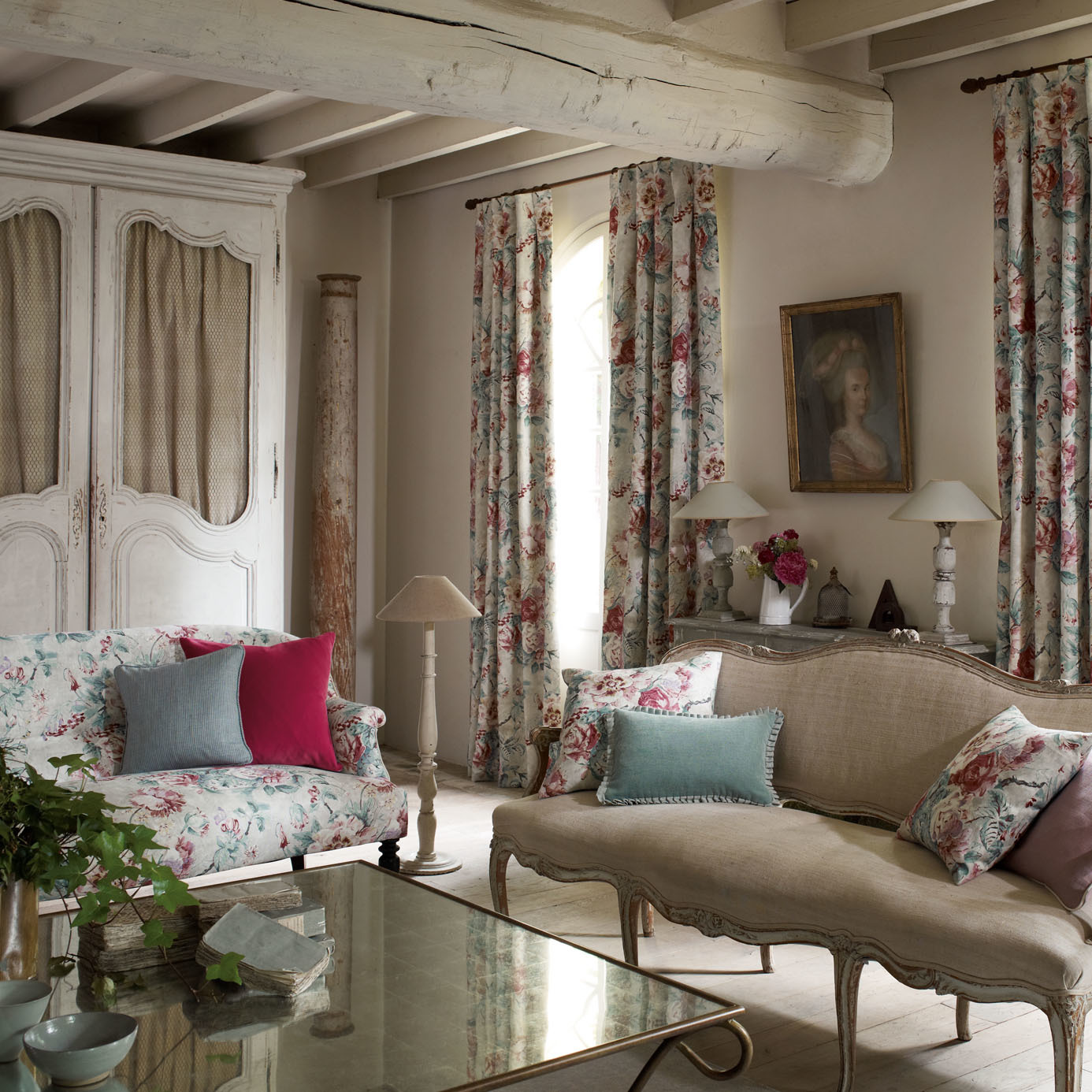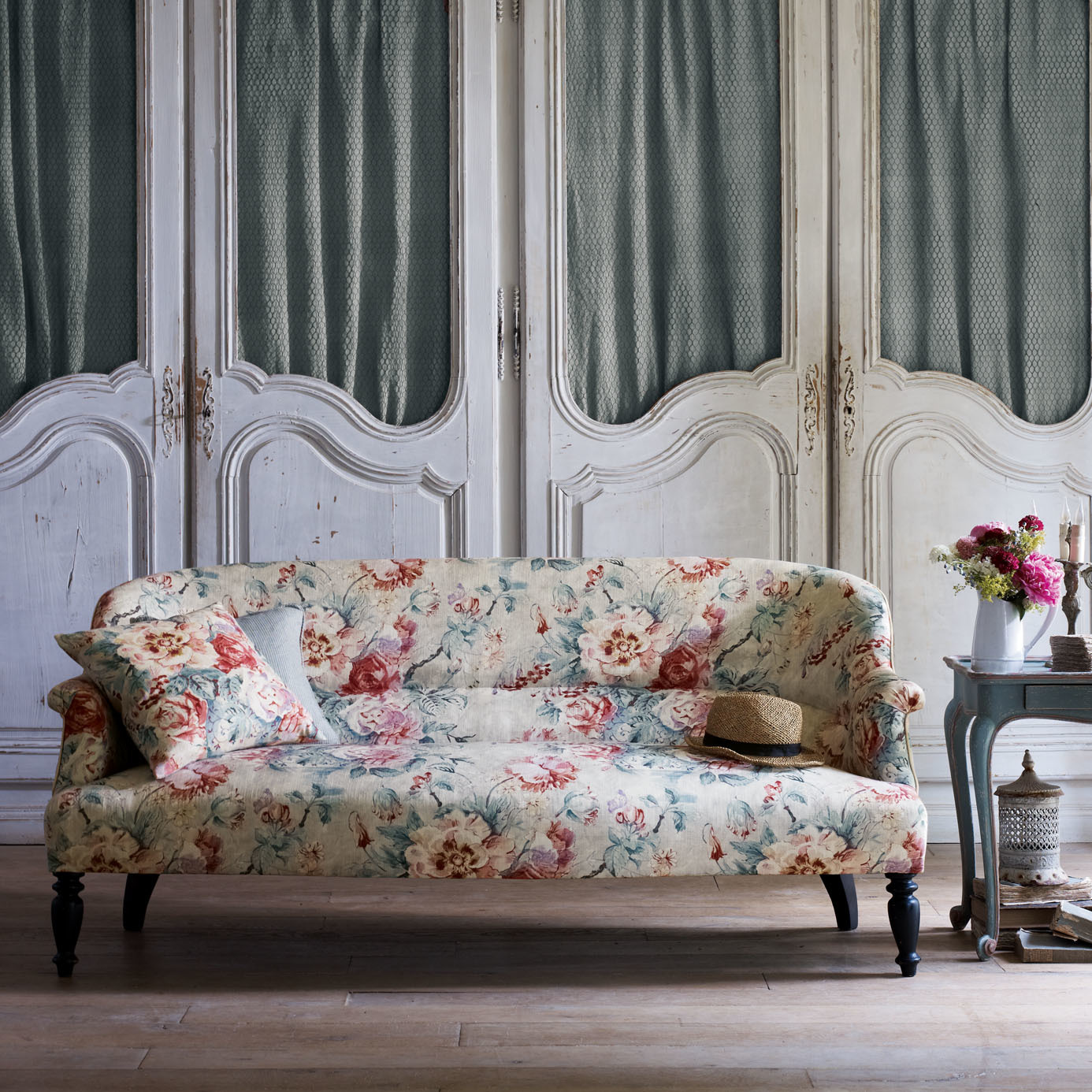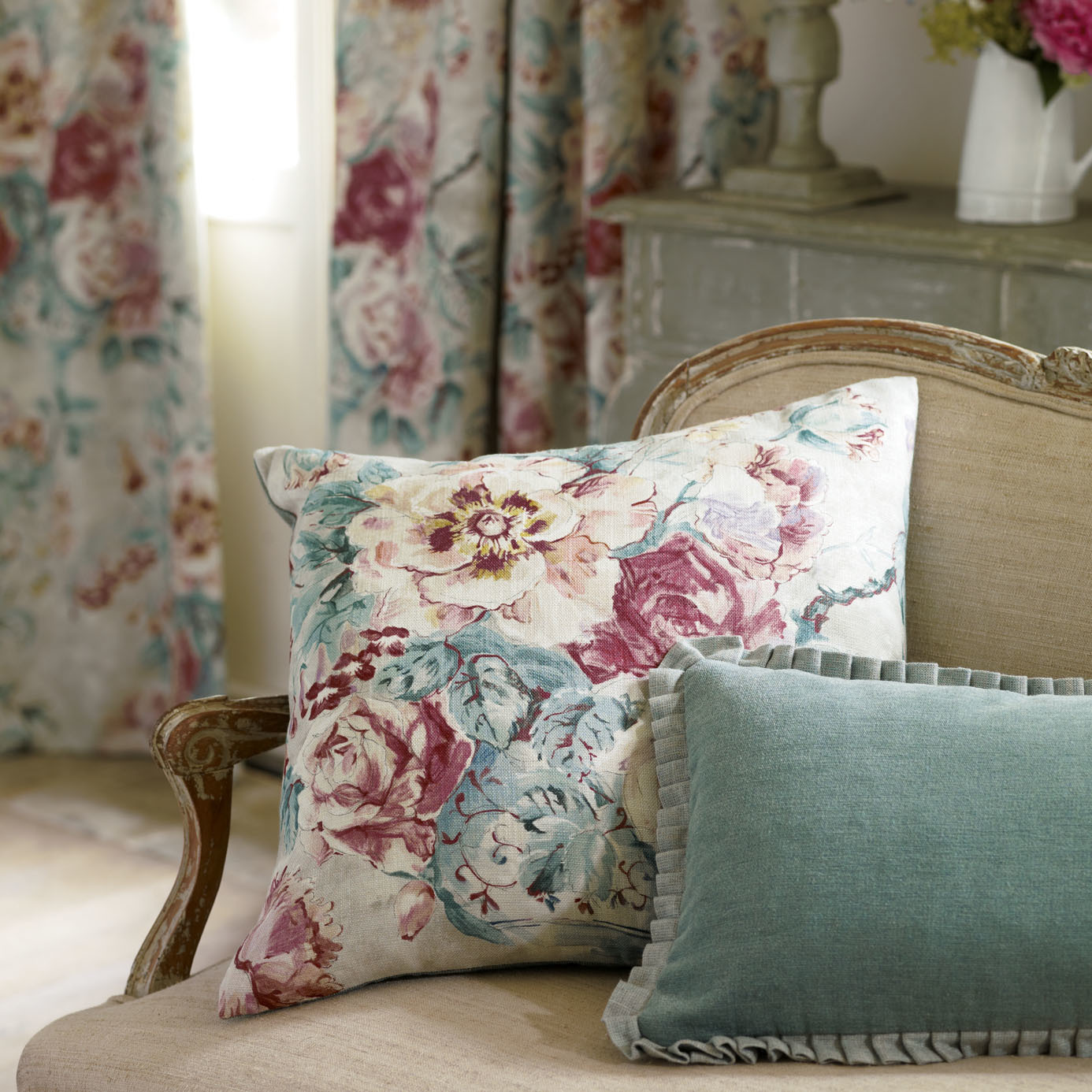 A modern interpretation on an archive document, this linen-mix fabric design was originally painted in oils and depicts an abundant floral bouquet in a ceramic vase, reminiscent of frescos in chateaux. Also available as a wallpaper.
