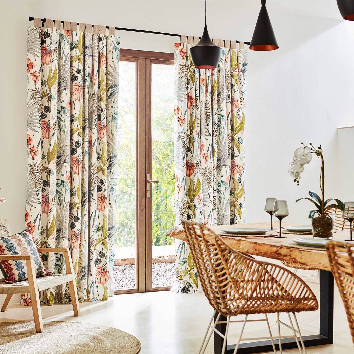 Pridajte letnú atmosféru s týmto výrazným potlačou inšpirovanom orchidejami z Ibize, tropickými listami a palmami. Habanera je vynikajúcim nositeľom farieb, použite ju ako hlavný prvok schémy, zvýraznite obľúbené farby a doplňte ich doplnkovými tónmi.