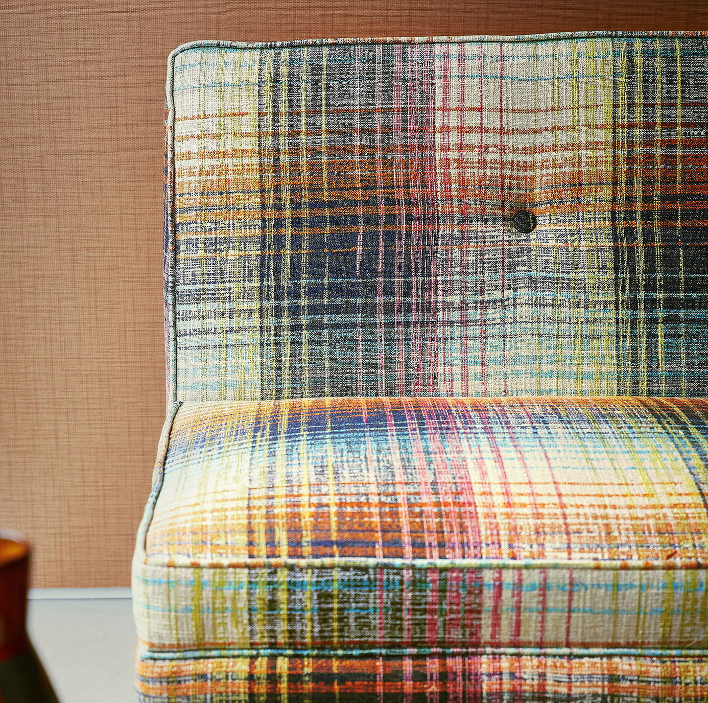 Hamada Weave - Hamada. Celebrating the check, this fabulous large-scale plaid fabric displays a wonderful blend of colours from blue/green tones through to bursts of pink and forms a relaxed, painterly checked pattern suitable for curtains, blinds and upholstery in contemporary homes and classic snugs.