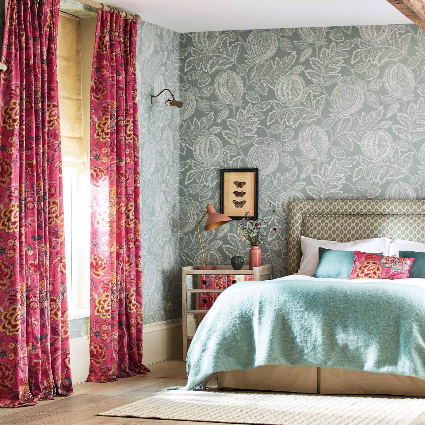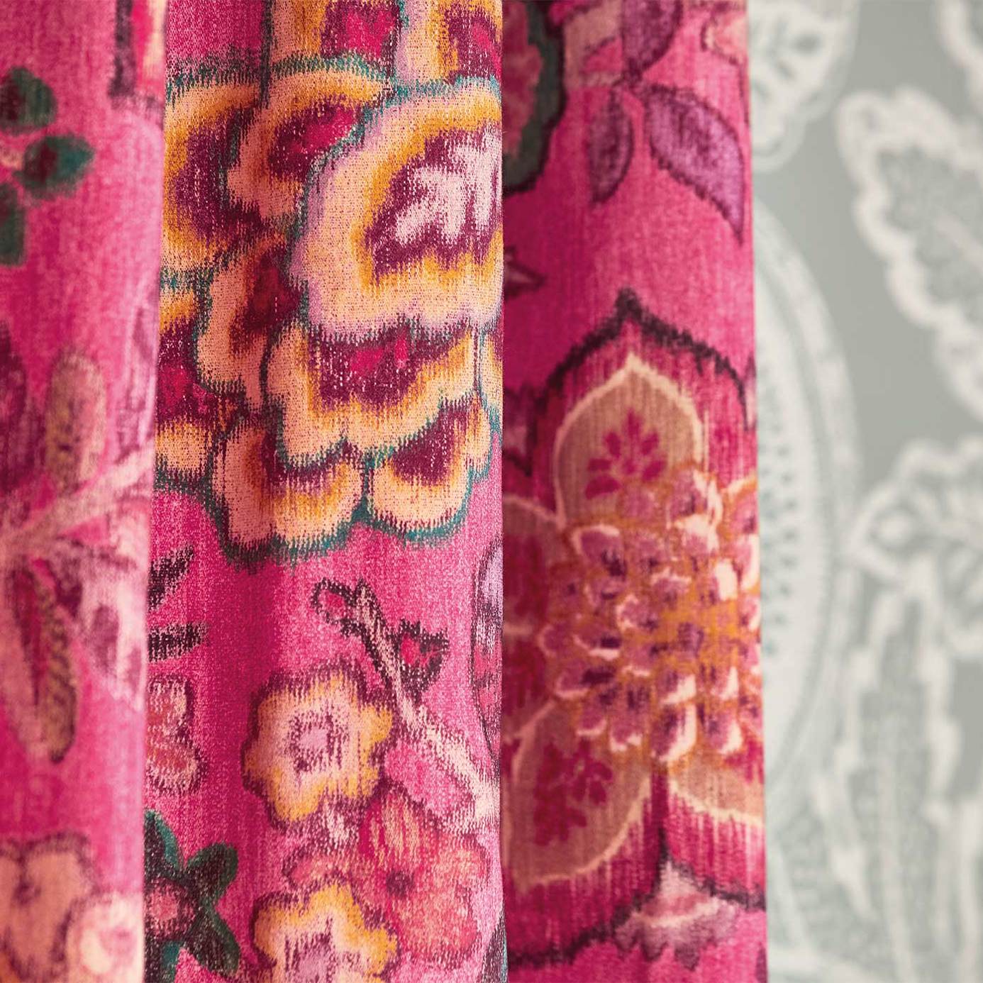 The softly diffused edges of this archive design give the look of a woven ikat, printed to create a gloriously colourful trail of stylised birds and flowers. The perfect way to liven up a room, add drapes in Hibiscus and upholstery in Emerald and Indigo/Cherry.
