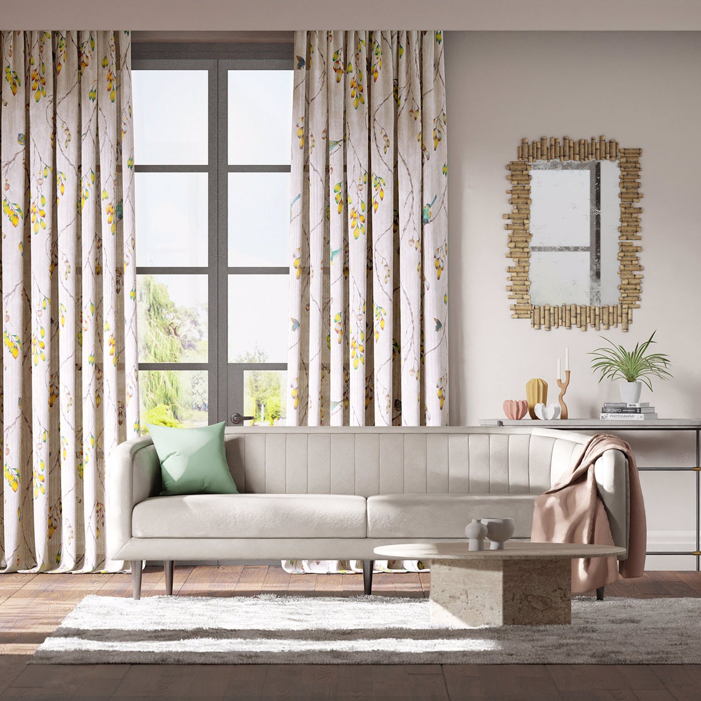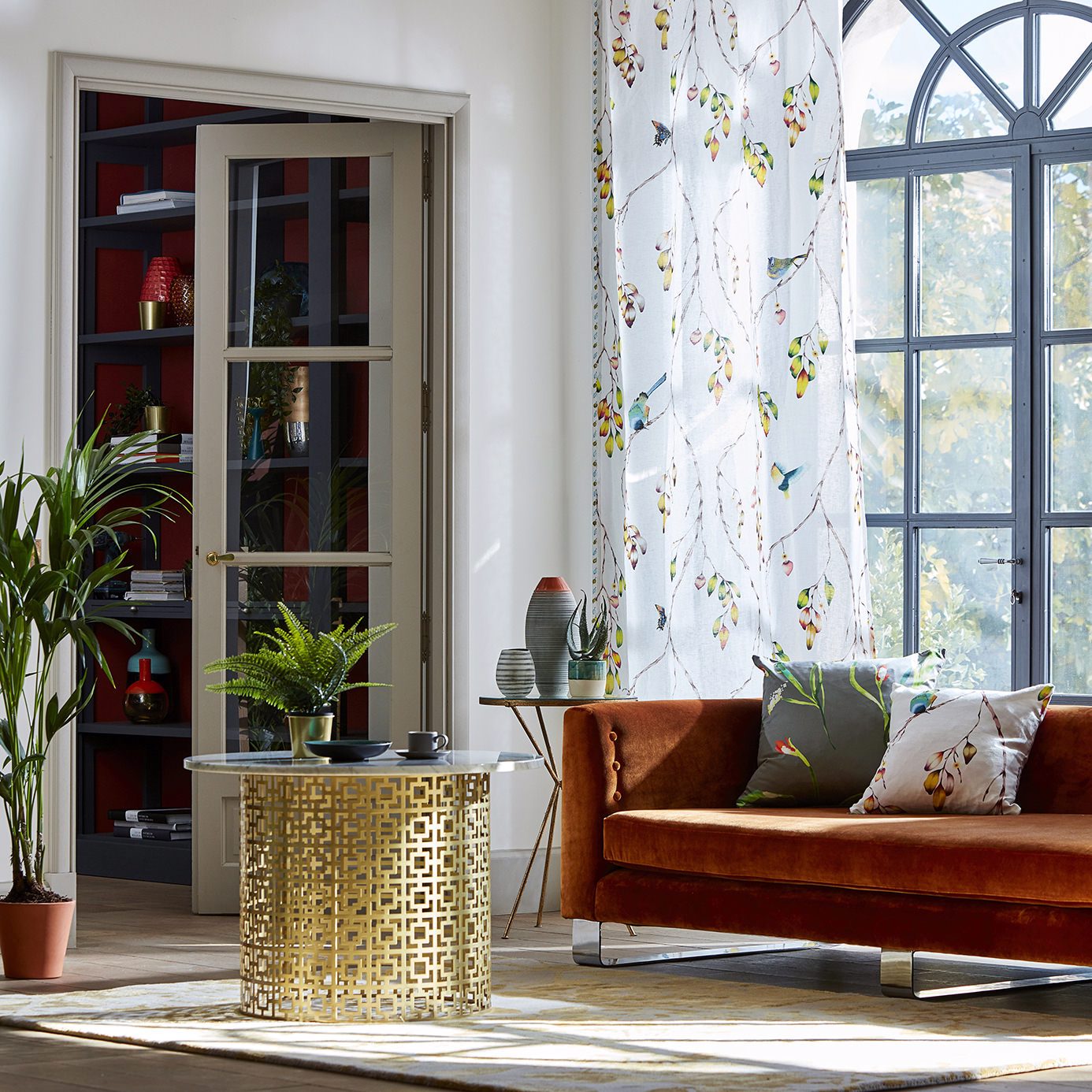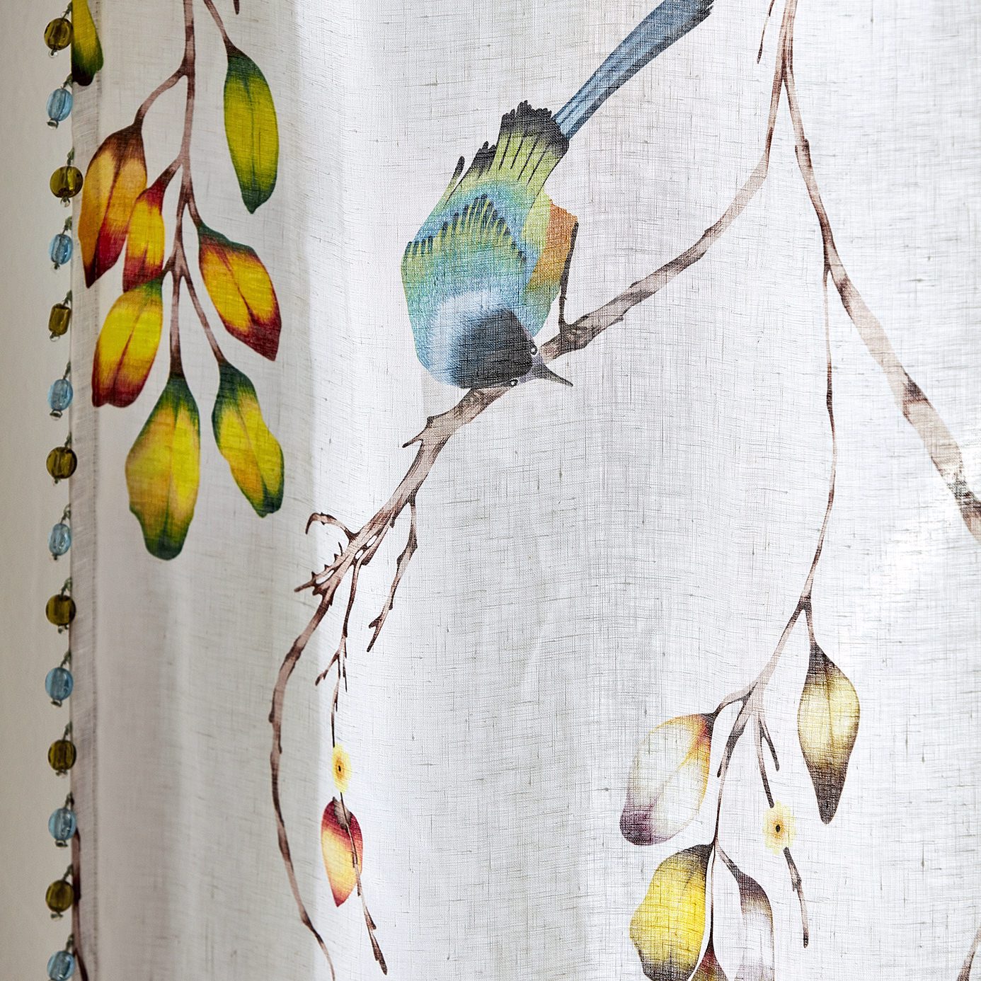 Zapara Fabrics - Iyanu Voile. This diaphanous voile fabric includes carefully etched butterflies and birds perching on willow-like branches in a wide variety of colourways. A stunning choice for airy living rooms.