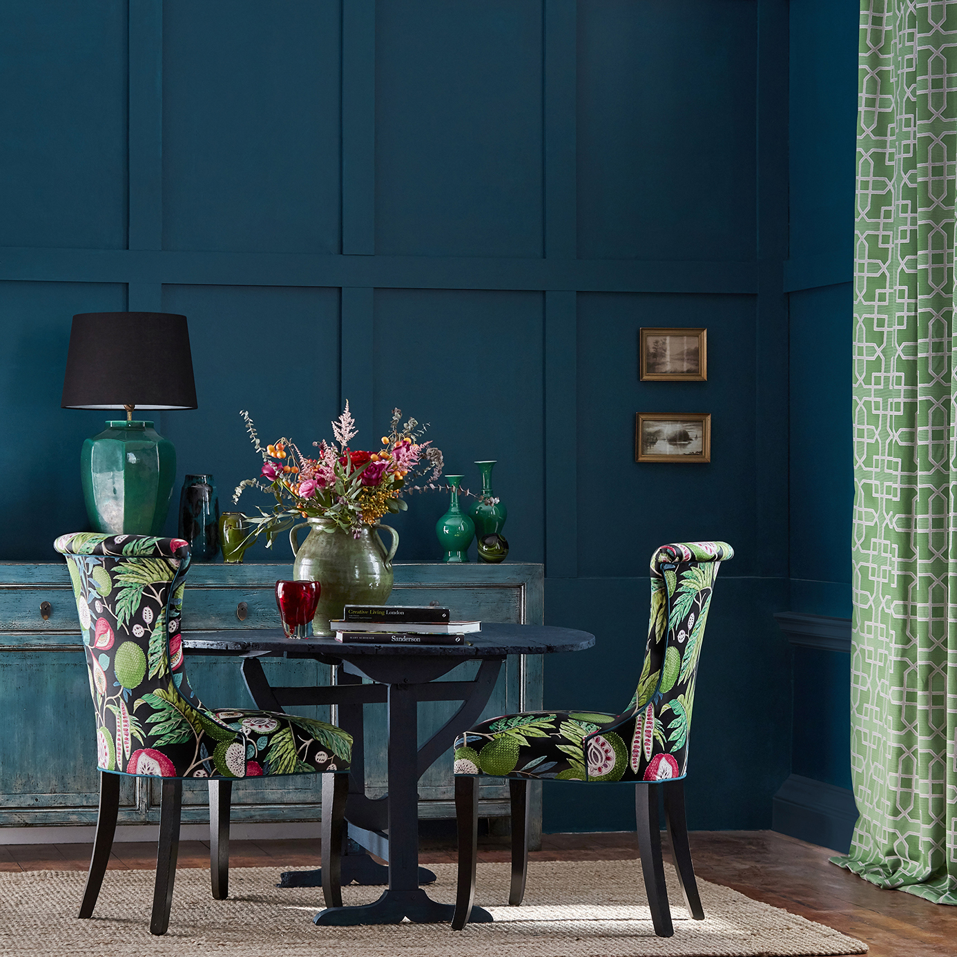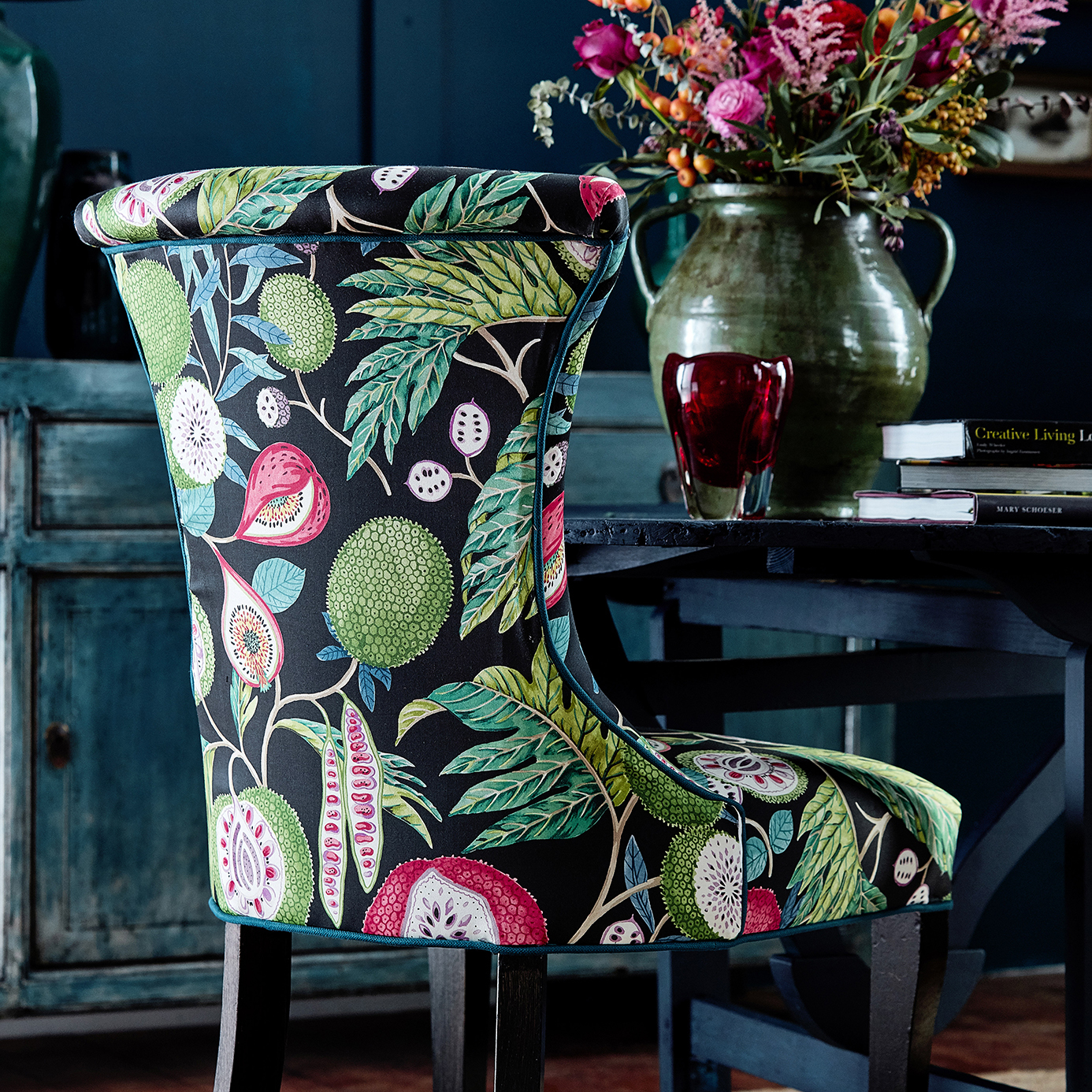 The jackfruit has an intriguing history, having been one of the main causes of the mutiny on the Bounty' in 1789. In this stunning Sanderson design, the stylised jackfruit, surrounded with intricate botanical detail creates a real statement.