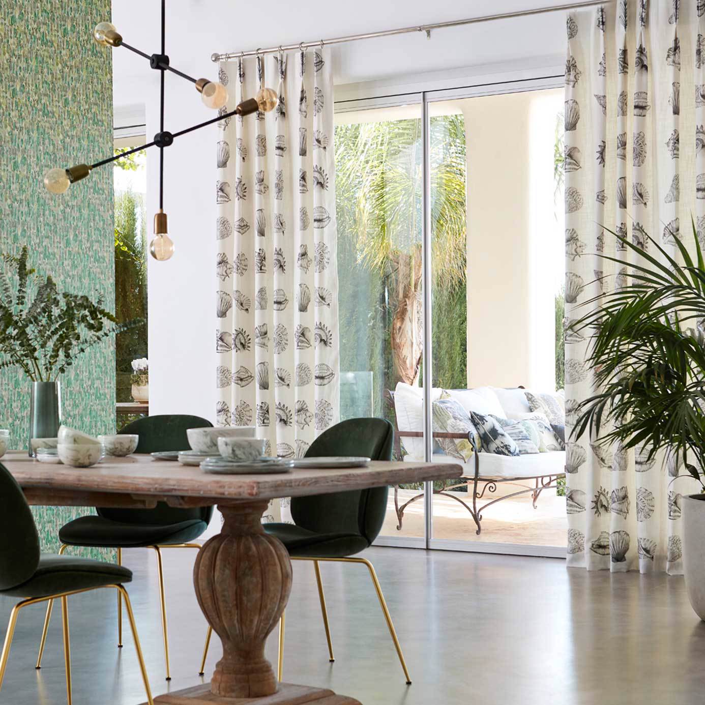 Anthozoa Fabrics - Kabibi. An assortment of watercolour seashells arranged in neat formation on this linen mix fabric. Ideal for introducing a seascape element to your home.