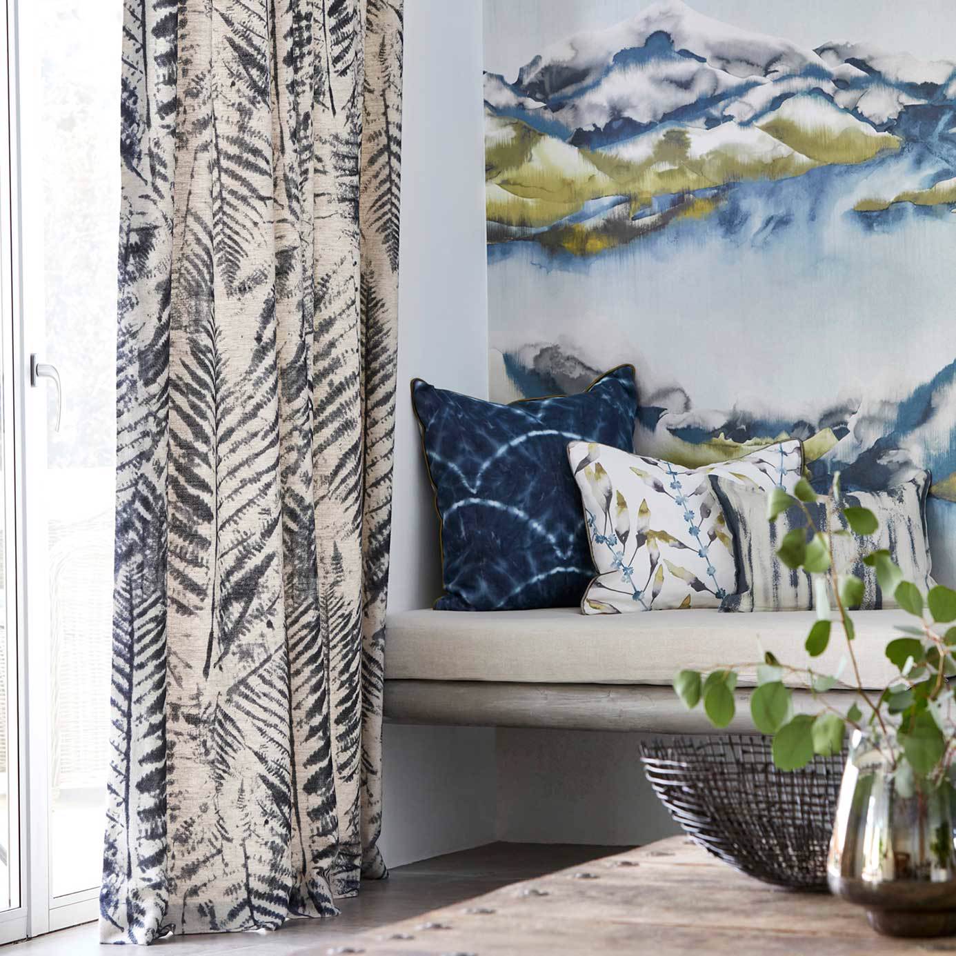 Anthozoa Fabrics - Kayu. This shadowy print of a fern dipped in ink, produced on a soft cotton-linen mix fabric, is ideal for blinds and drapes.