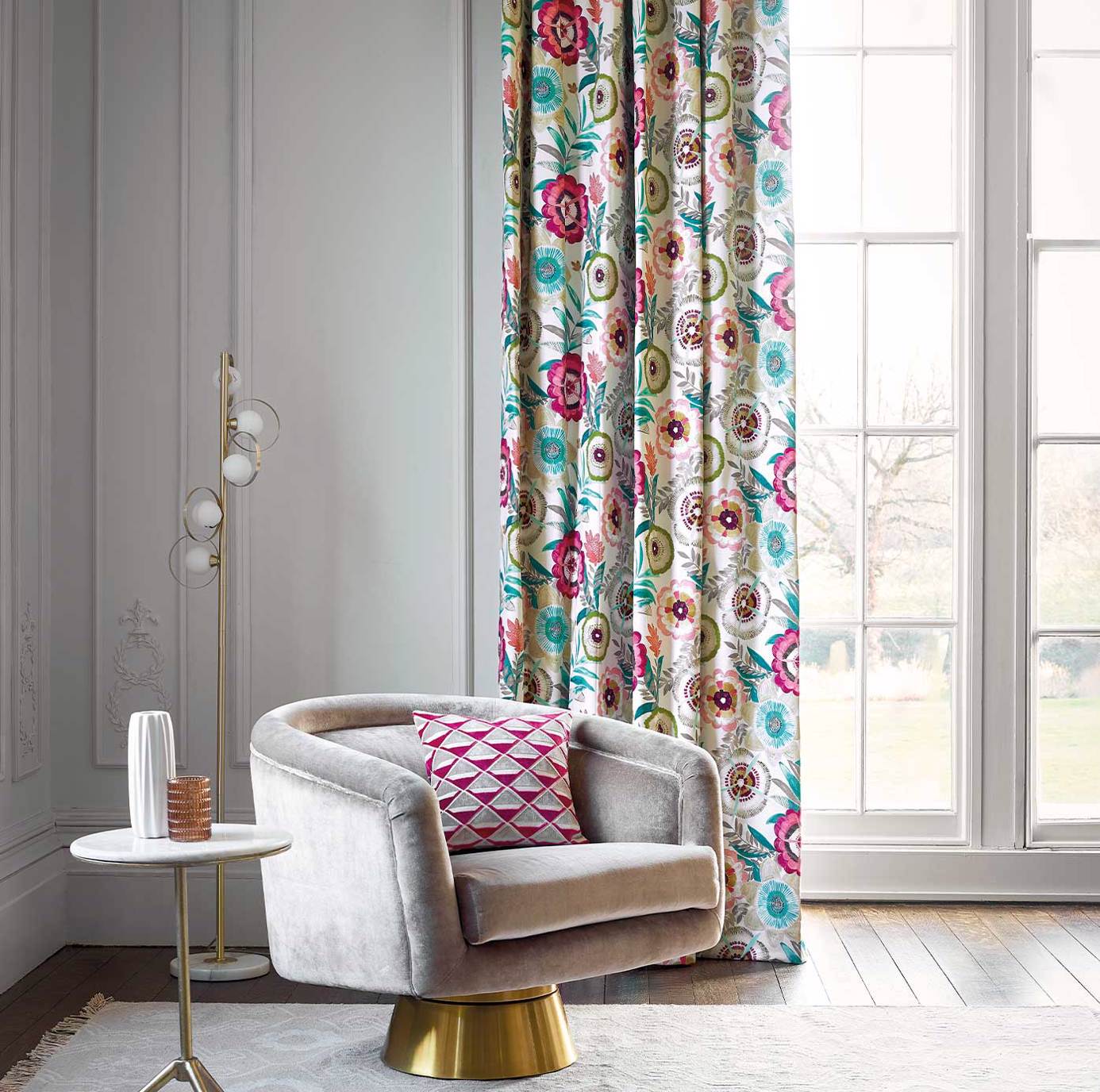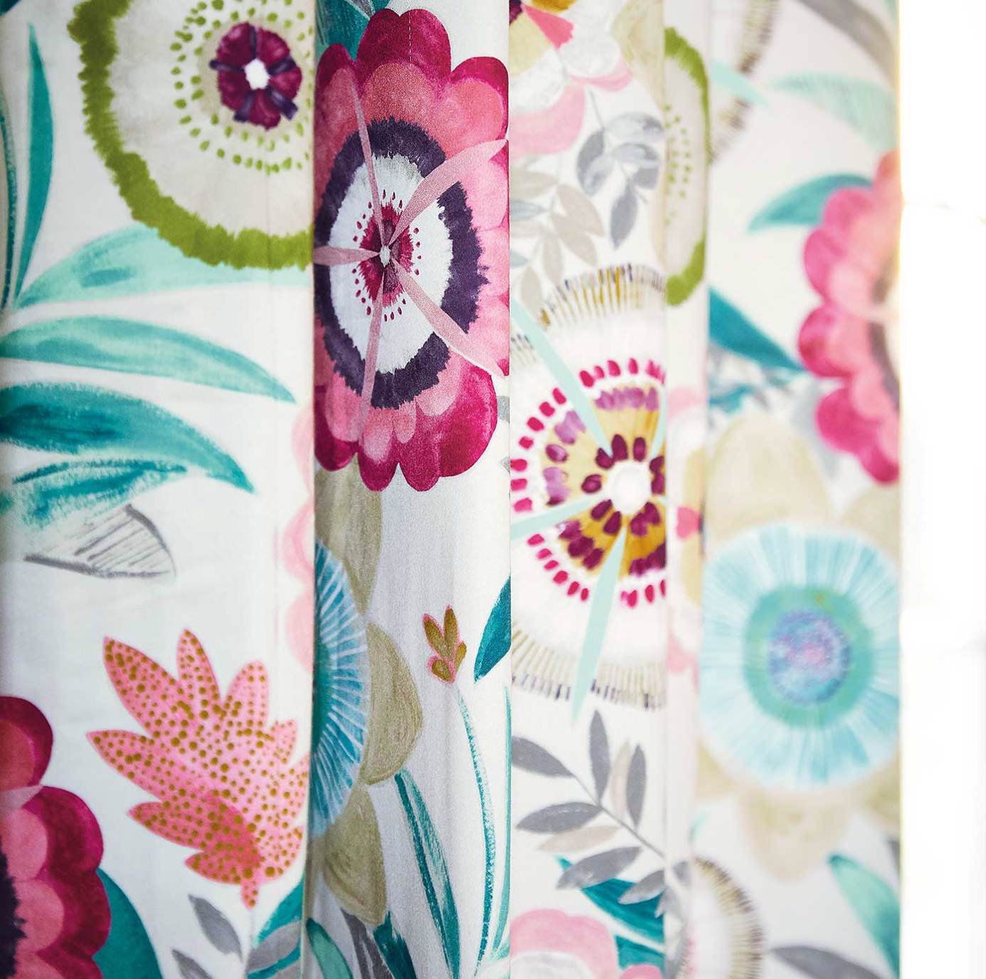 Salinas Prints And Weaves - Komovi. A joyful fabric covered in multidirectional flowerheads, inspired by an archive drawing. Digitally printed on a sumptuous satin cloth to retain the textural look and mark making of the original painting, it is available in beautiful colourways and is suitable for blinds, curtains and upholstery. A wallpaper of the same name is also available.