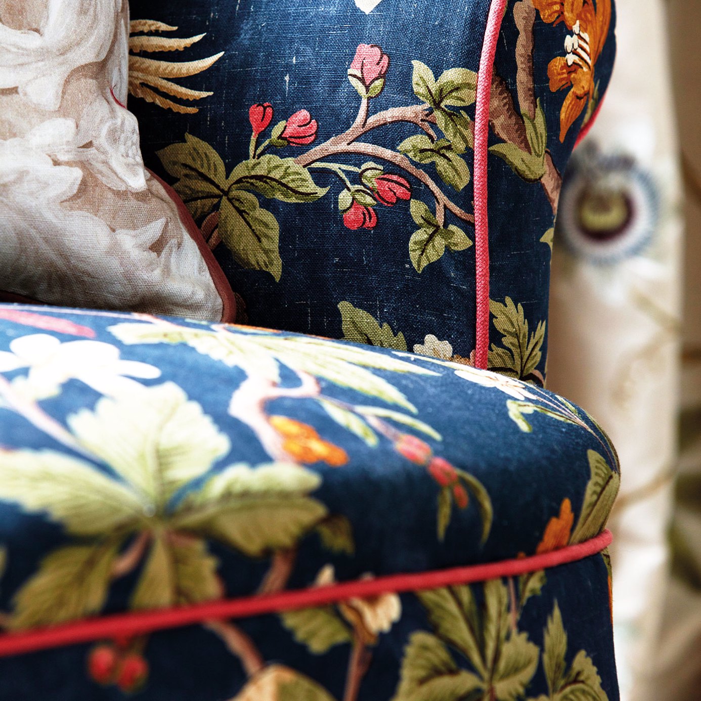 Taken from an archive document and with its classic chinoiserie appeal block printed pheasants flowers and leaves adorn this stylised Sanderson fabric. Available in three colourways: Chintz Navy and English Grey