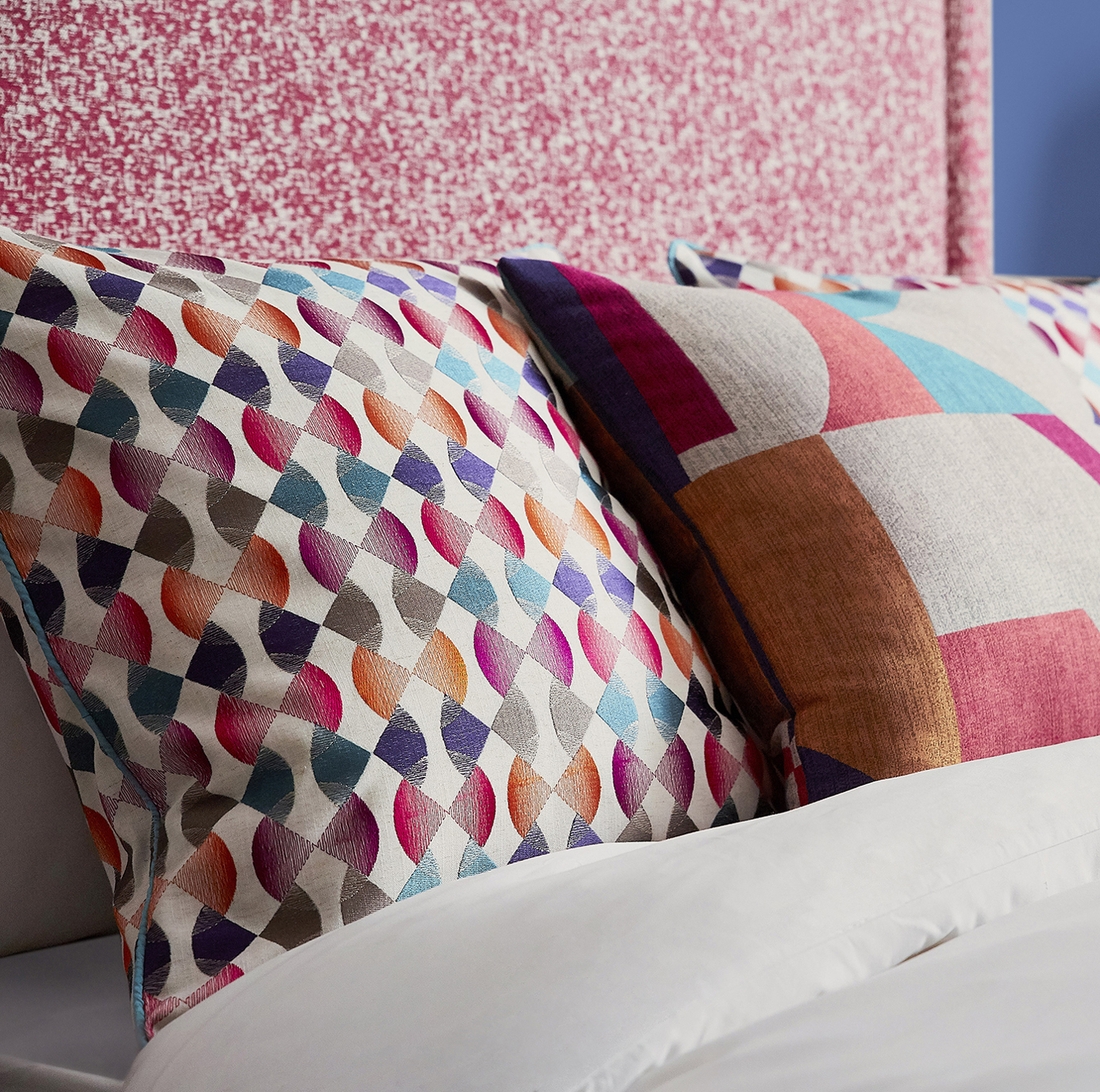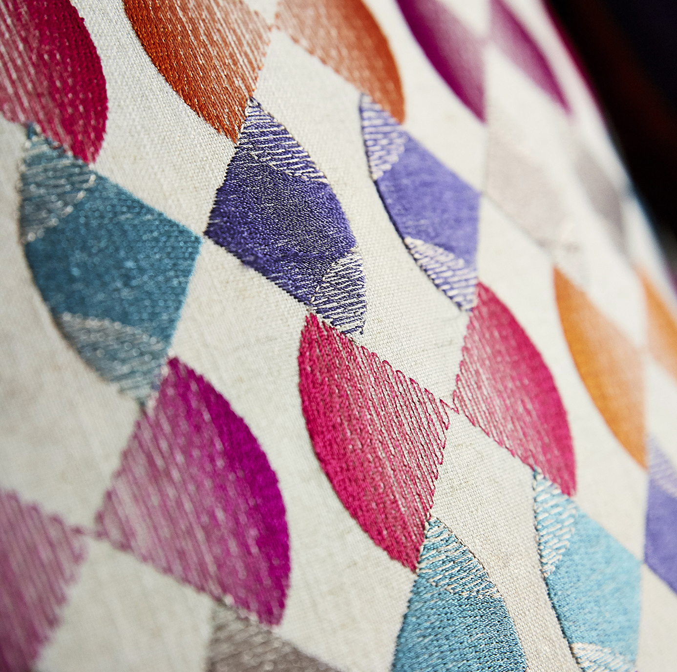 Maiolica is a neat, small scale geometric with an abundance of highlight colours. The embroidered ombre effect almost tricks the eye into seeing 3D diamond shapes within the overall design.