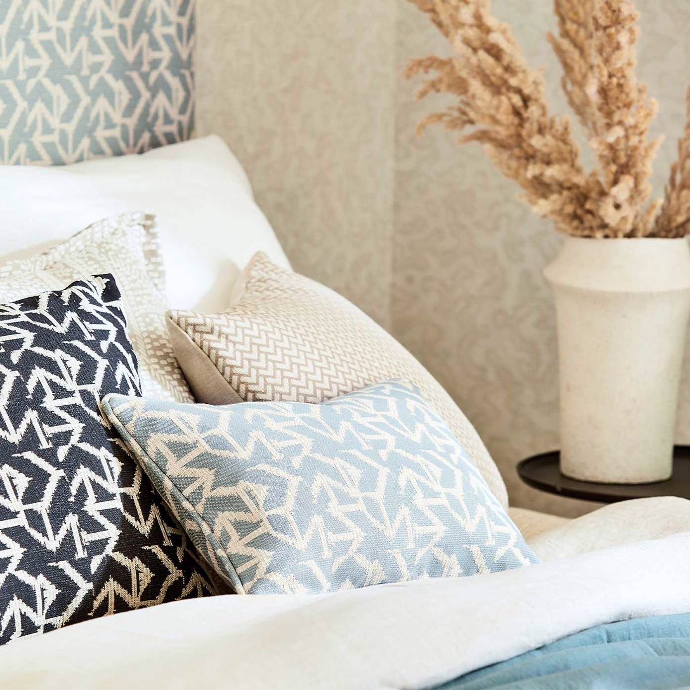 A mid-scale geo of repeating chevrons and squares mingle to create this contemporary tile design. Woven in a cotton/viscose/linen mix and with an ikat edged look.