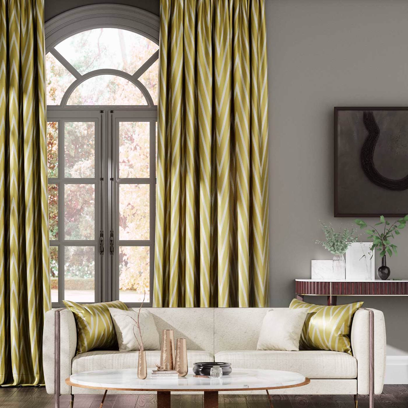 Tekstúrovaná látka s veľkým horizontálnym šípkovým vzorom na falešnom hodvábe. Ideálne pre moderné záclony.