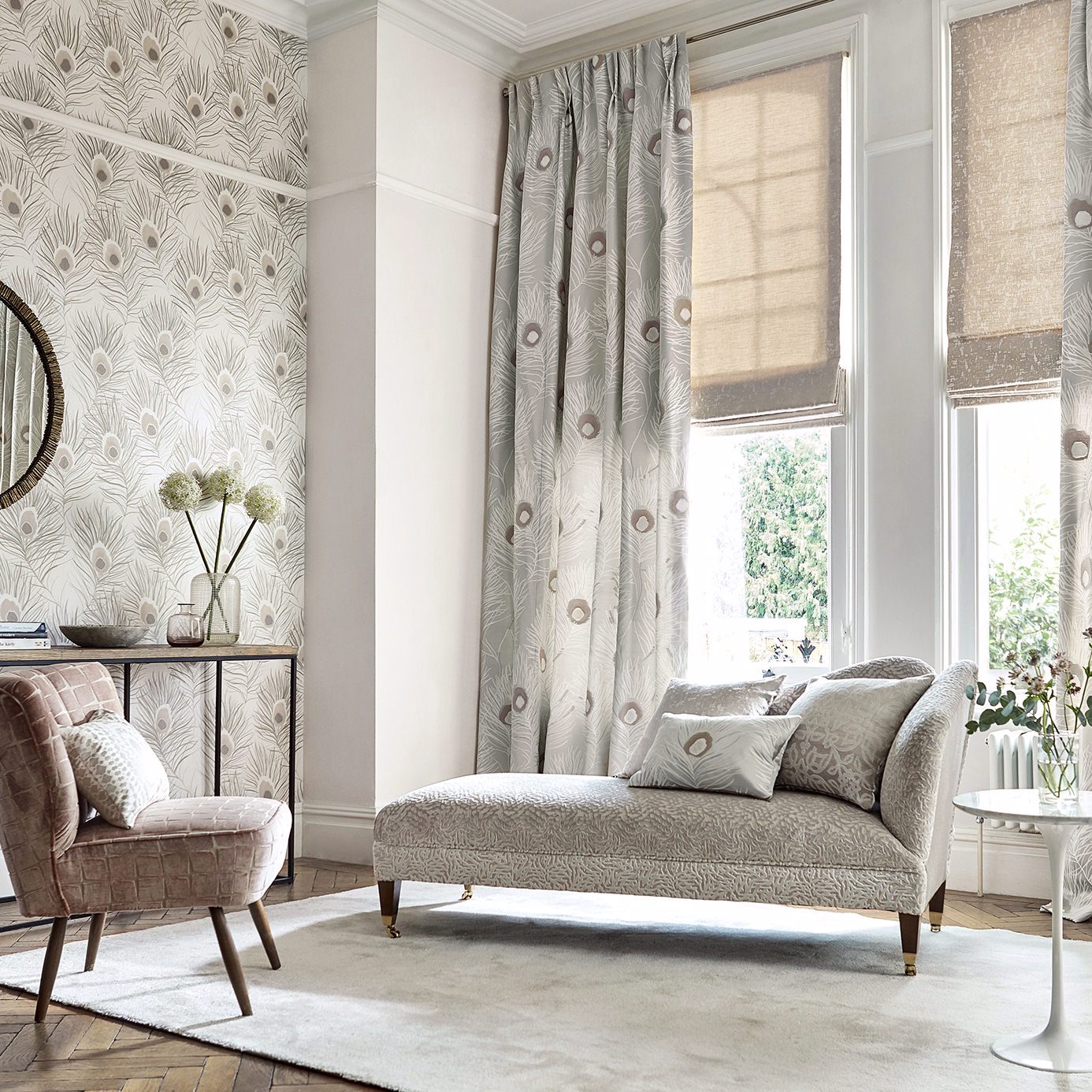 Tkaniny Paloma - Orlena. Elegántny tkaný žakárový dizajn vo vybraných farbách so veľkými pierovými motívmi zdobenými náznakmi kovového lesku na krásnom pozadí s lesklým povrchom. K dispozícii je tiež tapeta s rovnakým názvom.