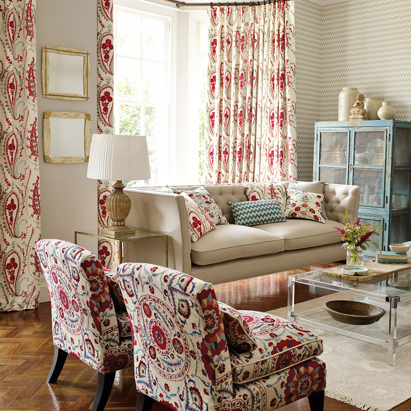 Ottoman Flowers is a stylised flower, whose central motifs are taken from an original Uzbekistani embroidered Suzani bedcover. This fabric has been printed with texture to capture a time-worn antique feel.