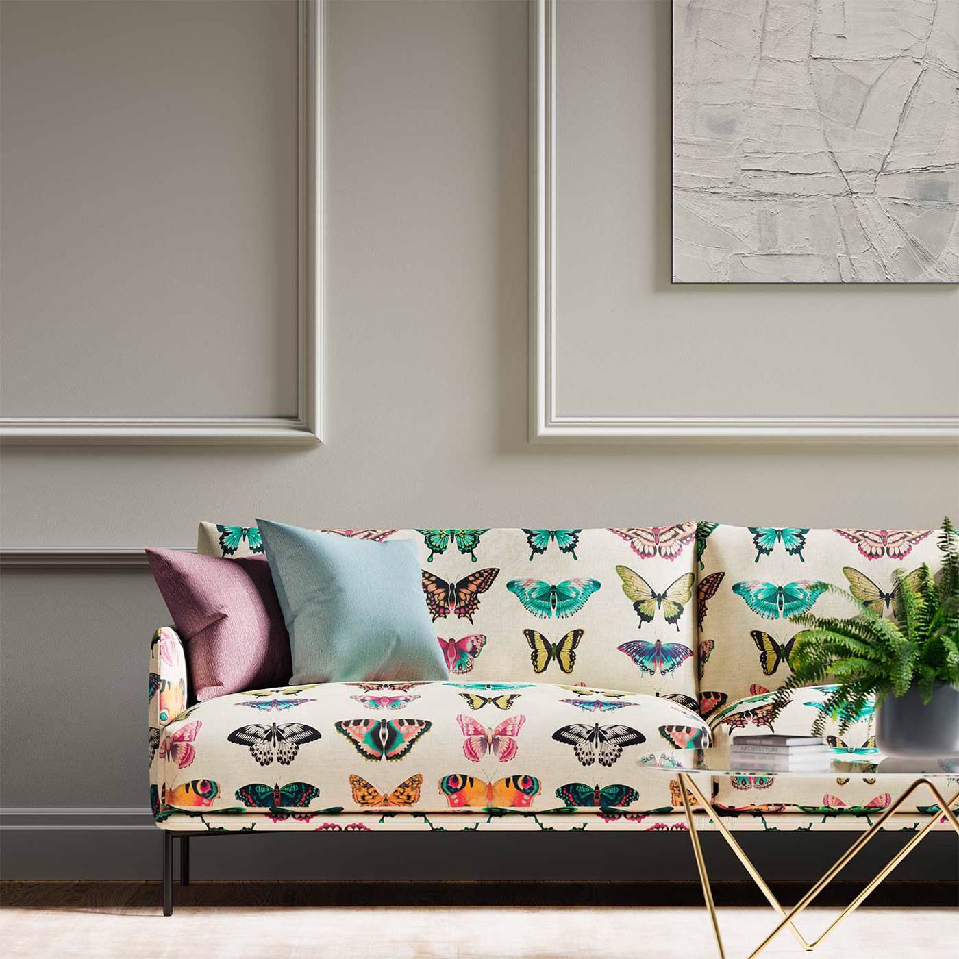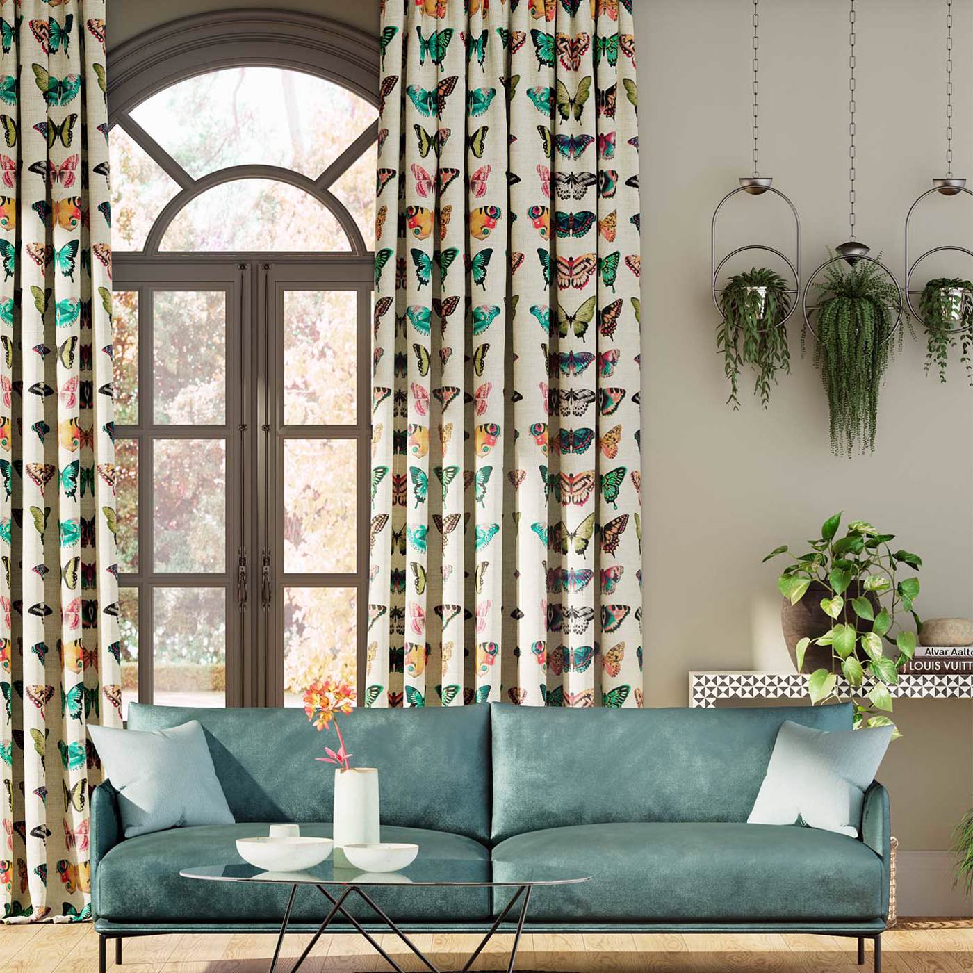 Na tejto látkovej vzore je usporiadaný kŕdel motýľov maľovaných farbami.
