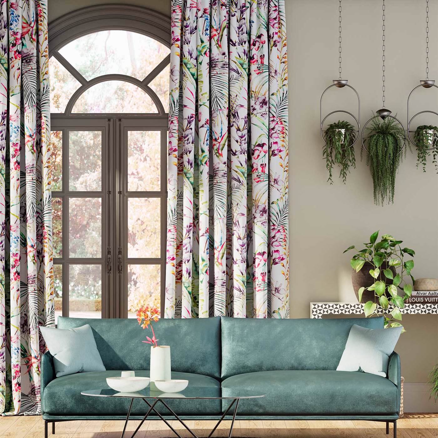 An overlapping profusion of exotic flowers fill this energetic fabric, which combines a multitude of beautiful colours to create a dynamic design.