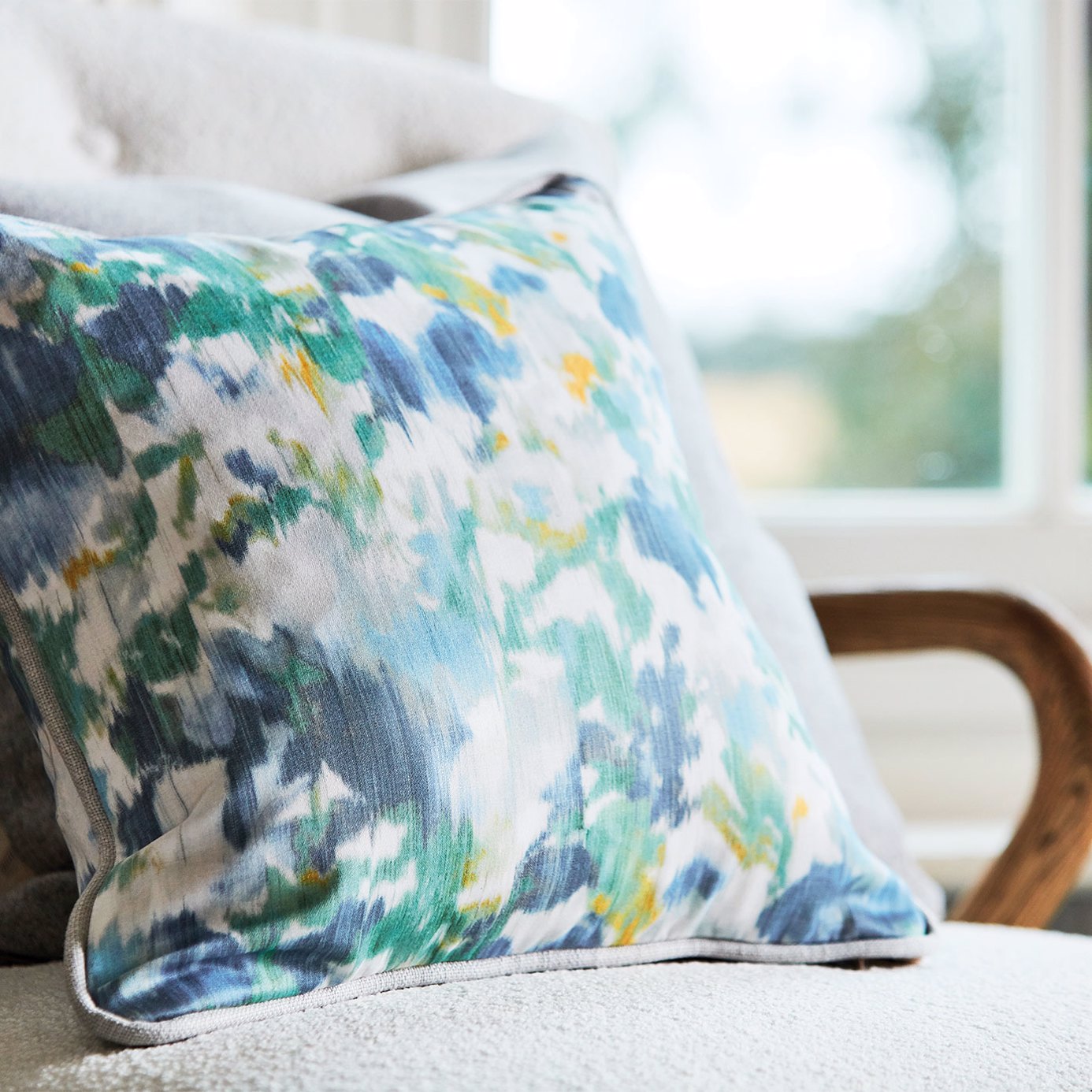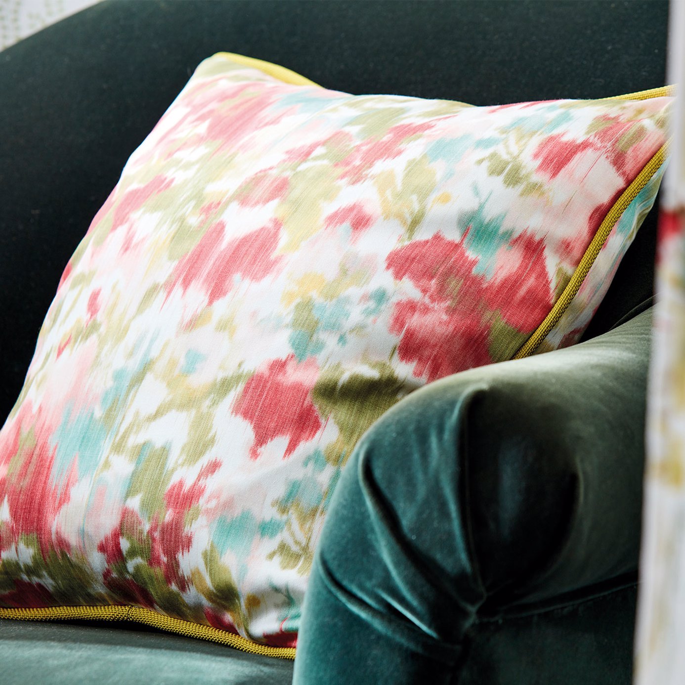 This crisp abstract pattern captures the tones of spring flowers and gently rippling waters. Spontaneous and colourful this contemporary ikat watercolour introduces a versatility that can be adapted to any scheme. Available in two colourways: Indigo/Teal and Raspberry