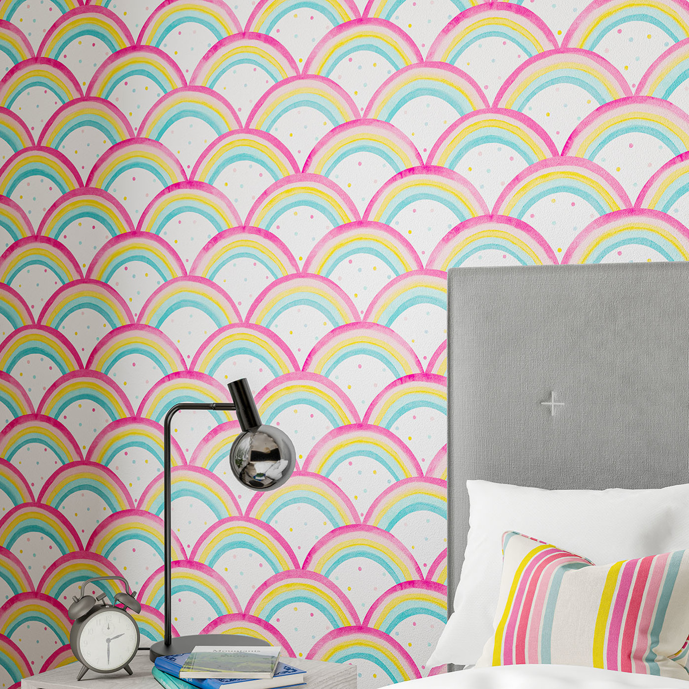 Wish upon this rainbow and make design dreams come true! Glorious vibrant colours create the perfect arch in this utterly joyous wallpaper. Cheerful and energetic, pair with Bon Bon fabric and revel in the happiness of this Harlequin wallpaper.