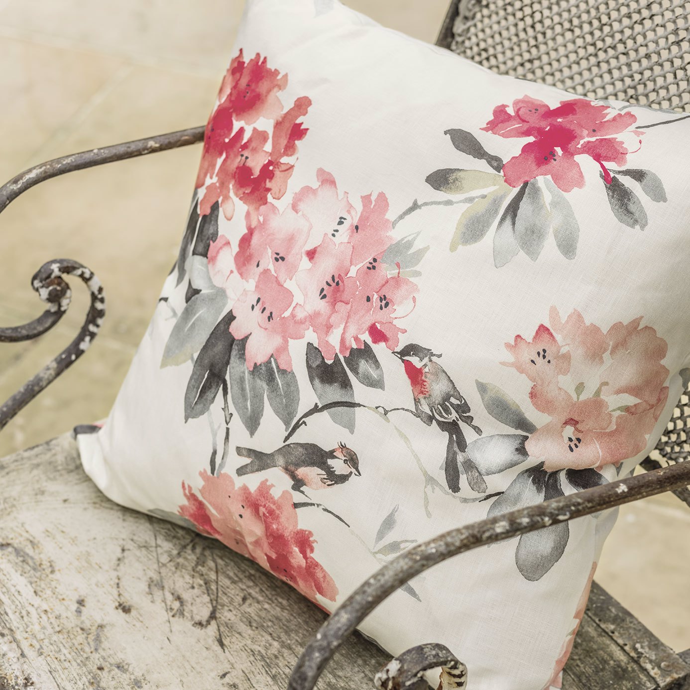 Krásne vtáky si sadajú na nápadné listy rododendronov, aby vytvorili botanický dizajn látky vyrobený z 100% ľanu. Tento dizajn prináša do domova dramatický a ženský vzhľad v živých farebných odtieňoch.