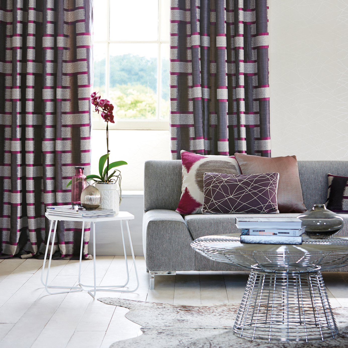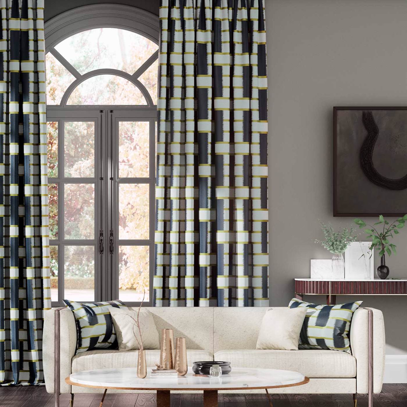 A modern geometric ikat design produced in a linen/silk mix fabric with an oriental feel in earthy colourways. Striking when used to create curtains blinds or cushions.