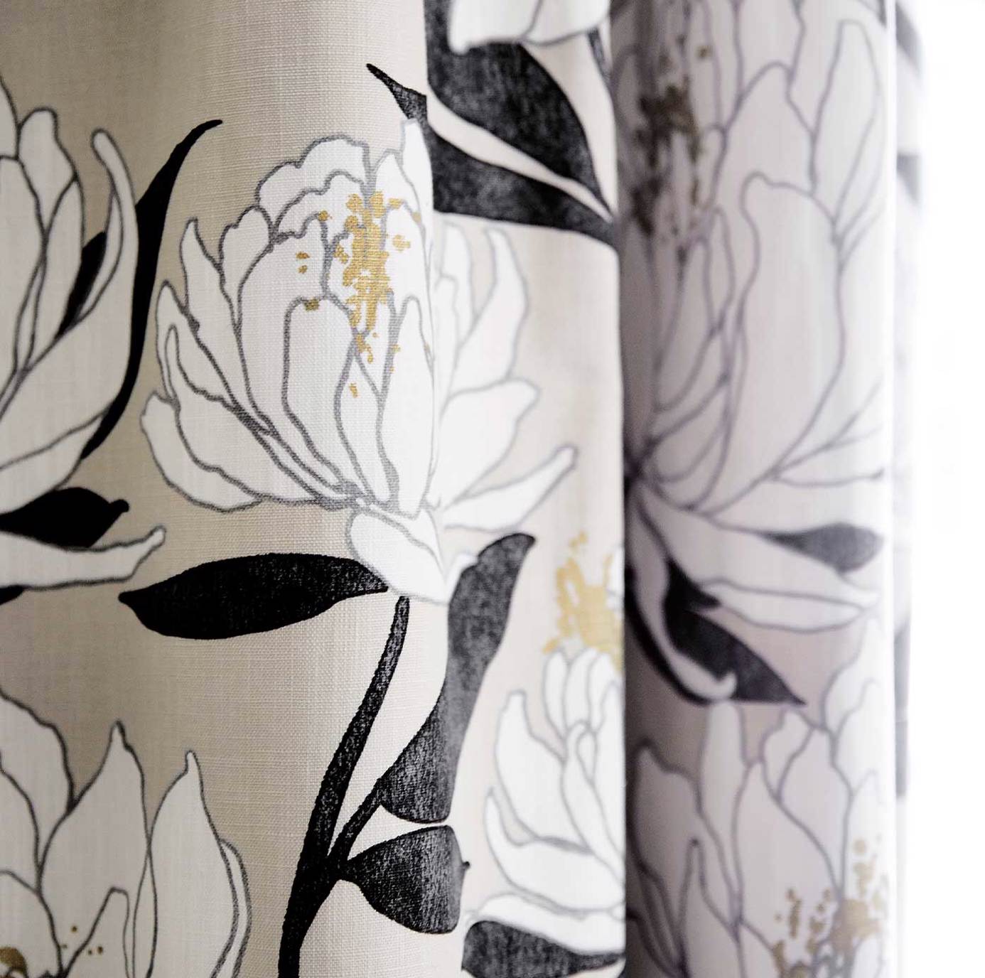 Salinas Prints And Weaves - Sebal. Glorious chrysanthemum flowers with delicate metallic highlights bloom on this cotton-line blend fabric. Available in light, mid and dark colourways, this design is suitable for blinds, curtains and upholstery. A wallpaper of the same name is also available.