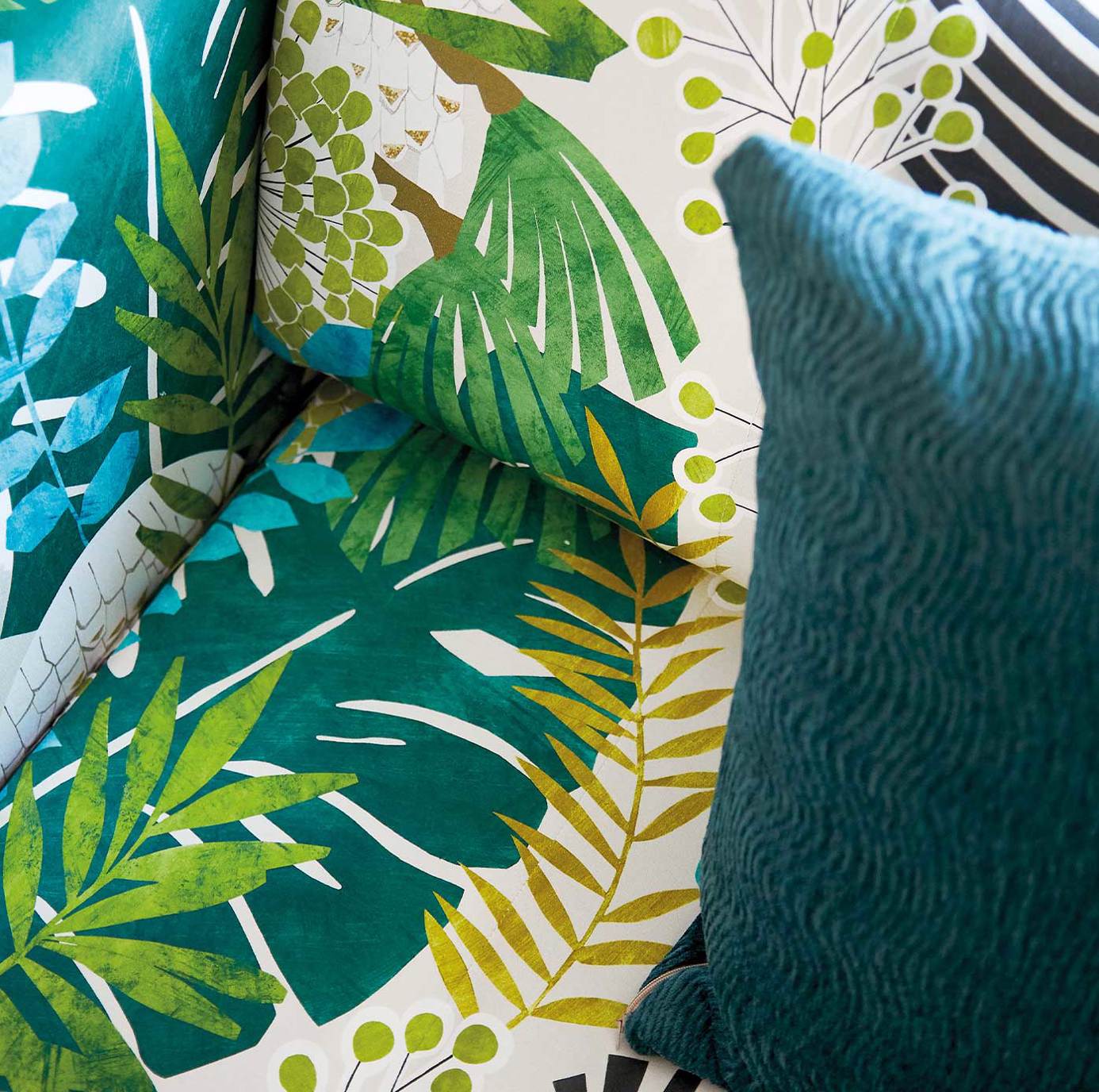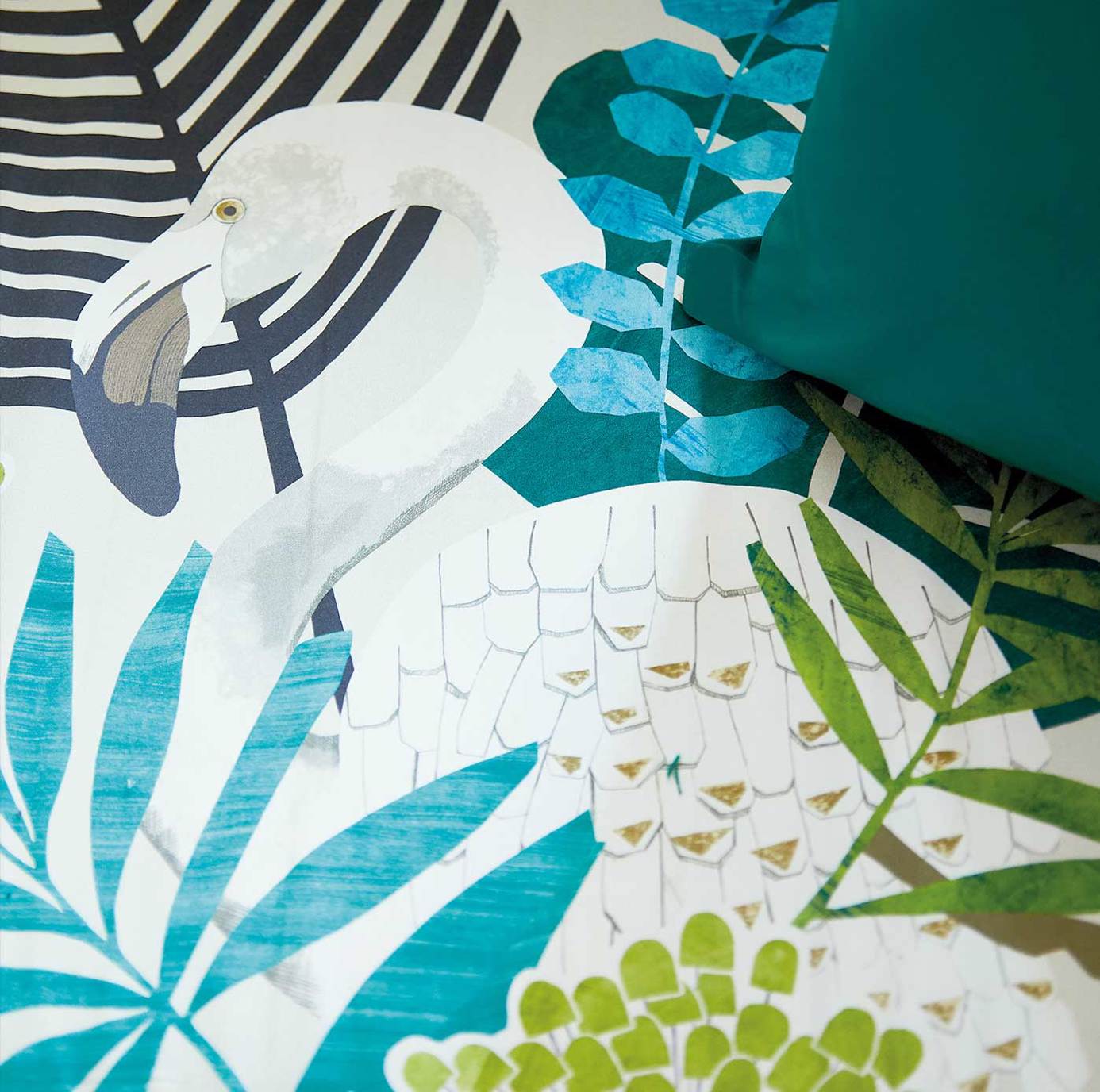 Salinas Prints And Weaves - Solana. The feature fabric pattern of the collection, with largescale white flamingos hiding in oversized foliage and produced on a beautiful 100% cotton cloth. Suitable for blinds, curtains and upholstery.