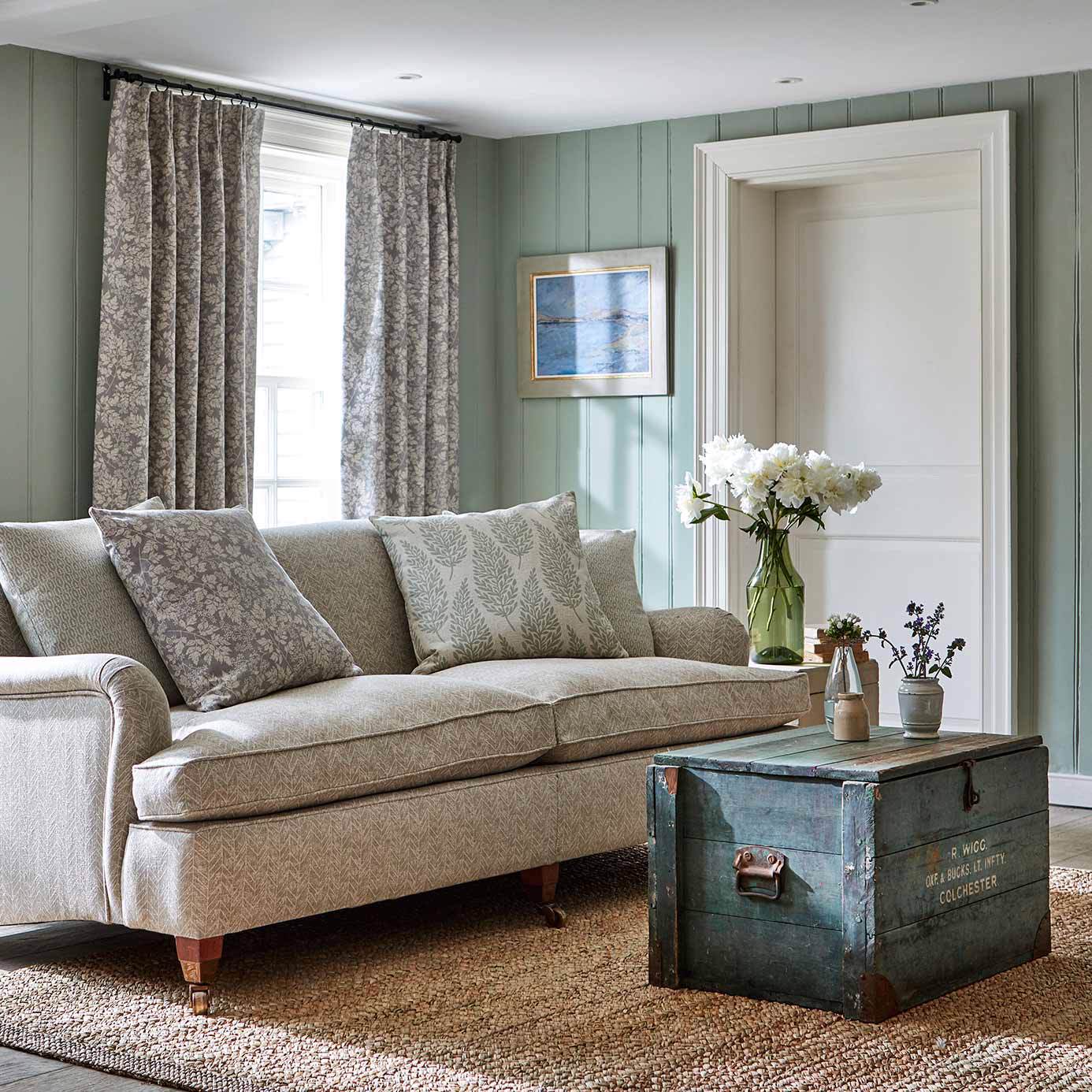 Overlapping leaves and floral sprigs are placed in multiple directions across this charming cotton-linen blend fabric design to create an elegant country look without dominating a scheme. A wallpaper of the same name is also available.