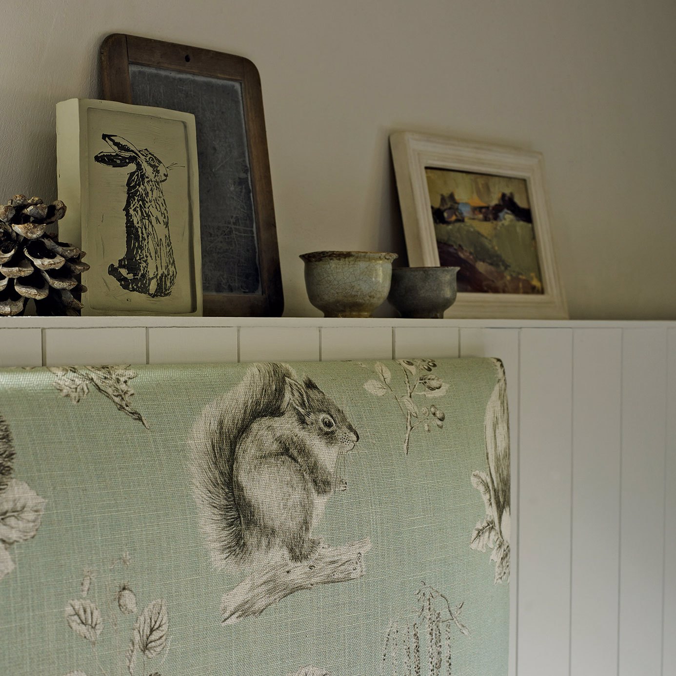 Pencil drawn in fine detail this charming printed fabric depicts the prettiest small wild British animals; a squirrel rabbit and hedgehog all set amongst sprays of natural British flora; acorns catkins and blackberries.