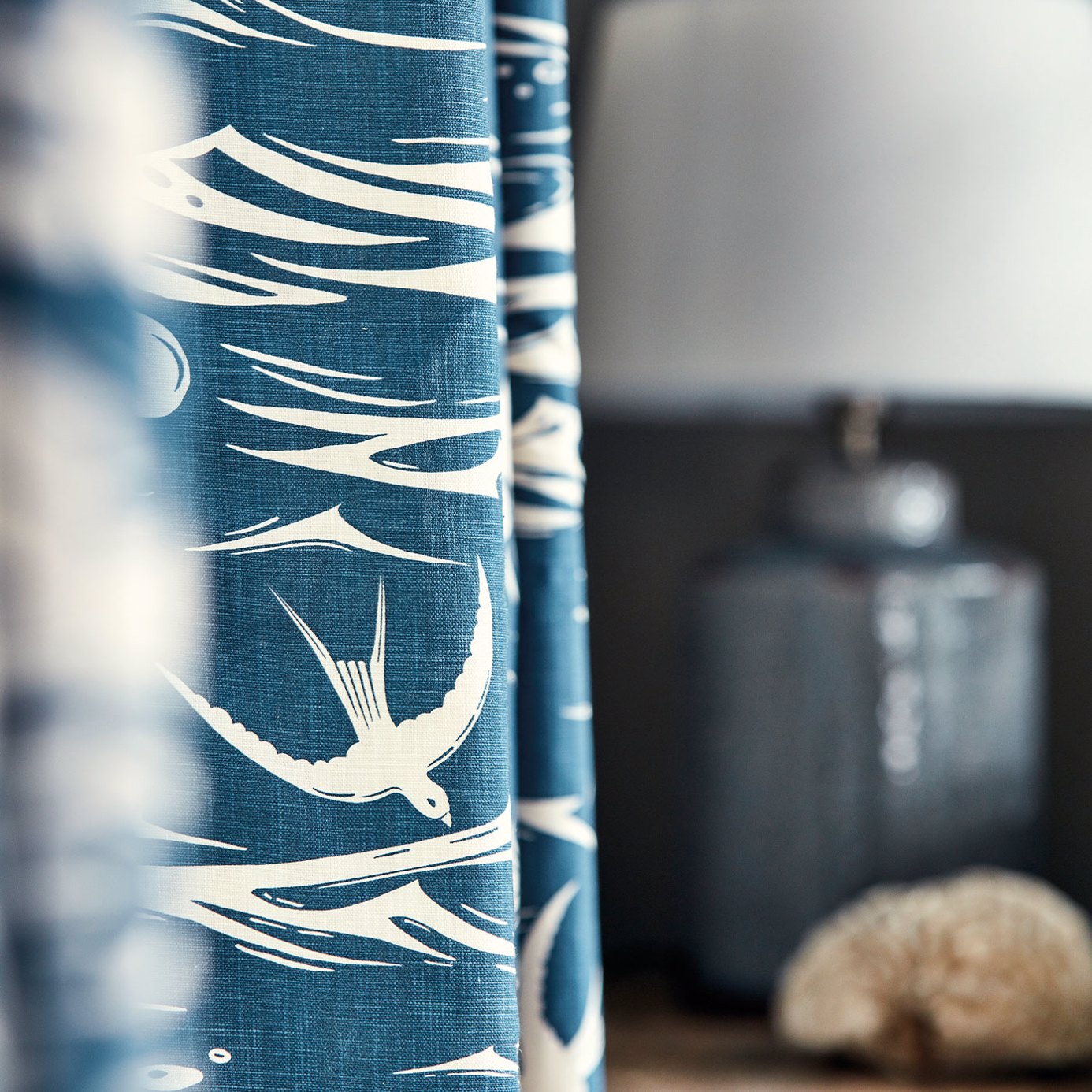 With its hand cut lino appearance and art-deco feel swooping swallows play amongst rolling waves in this stylised Sanderson print. Available in two colourways: Sea/Navy and Sea/Linen