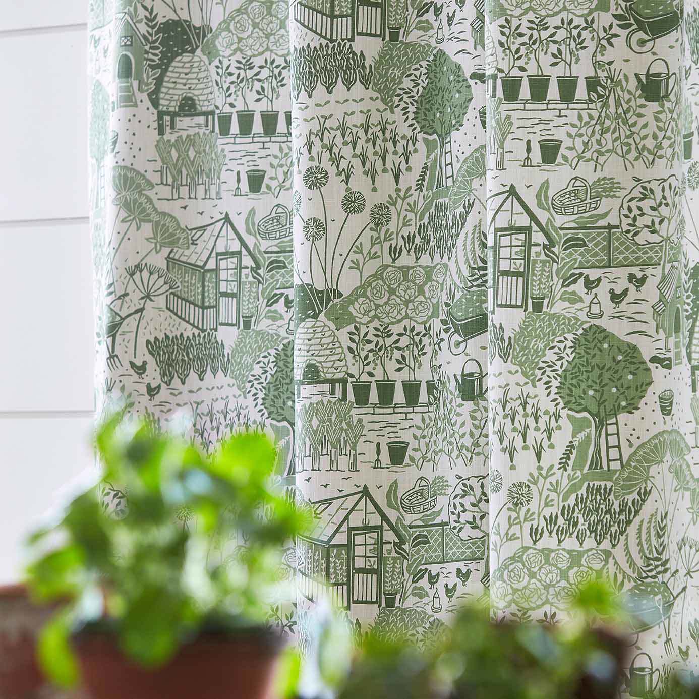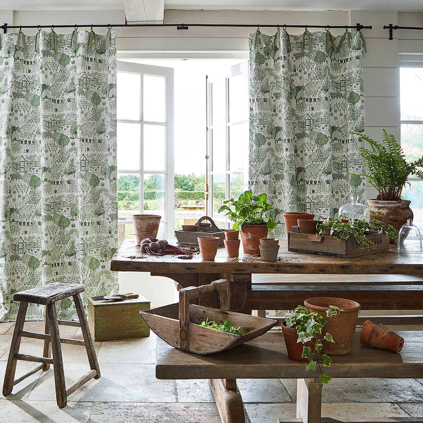 Zobrazovanie usporiadanej štruktúry parcelácie podčiaruje tento zvodný dizajn látky s radami zeleniny, skleníkmi, skladmi na kvety, kurníkmi a úľmi. Spárujte ju s tapetou rovnakého názvu v izbách s výhľadom na záhradu.